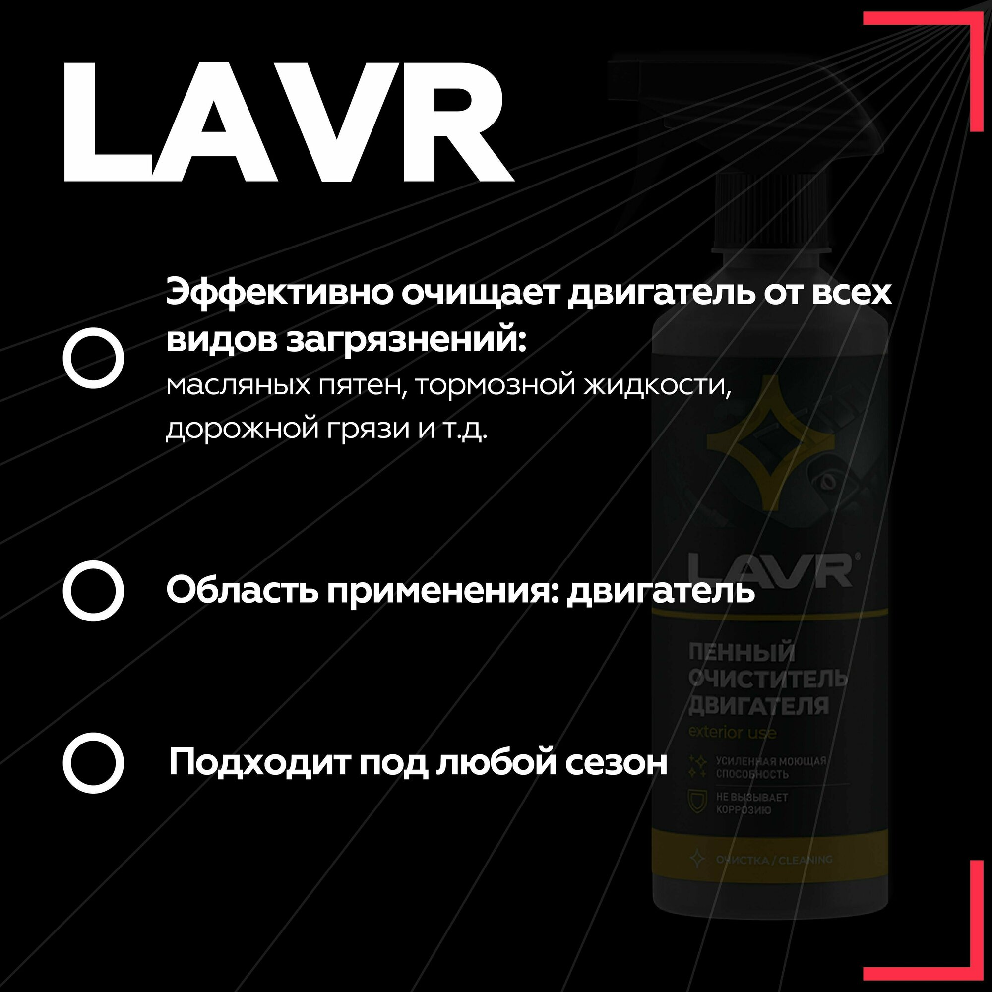 | Подробная комплектация | Пенный очиститель двигателя LAVR, 500 мл |