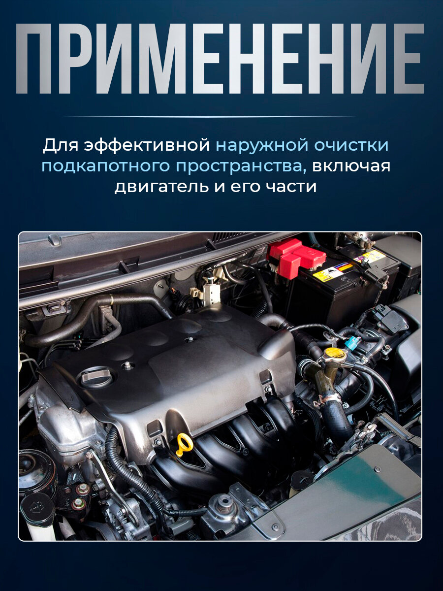 | Способ применения | 1. Заглушите двигатель, отсоедините клеммы от аккумуляторной батареи и дайте мотору остыть. Обработайте электрические разъёмы диэлектриком или закройте плёнкой, чтобы исключить попадание влаги. 2. Нанесите средство с близкого расстояния на загрязненную поверхность. 3. Для сильно загрязненных участков рекомендуется использовать щетку или кисть. 4. Дайте отработать средству 2-3 мин., не допуская его высыхания, после чего тщательно смойте водой без давления. Использовать с осторожностью на алюминиевых и пластиковых деталях. |