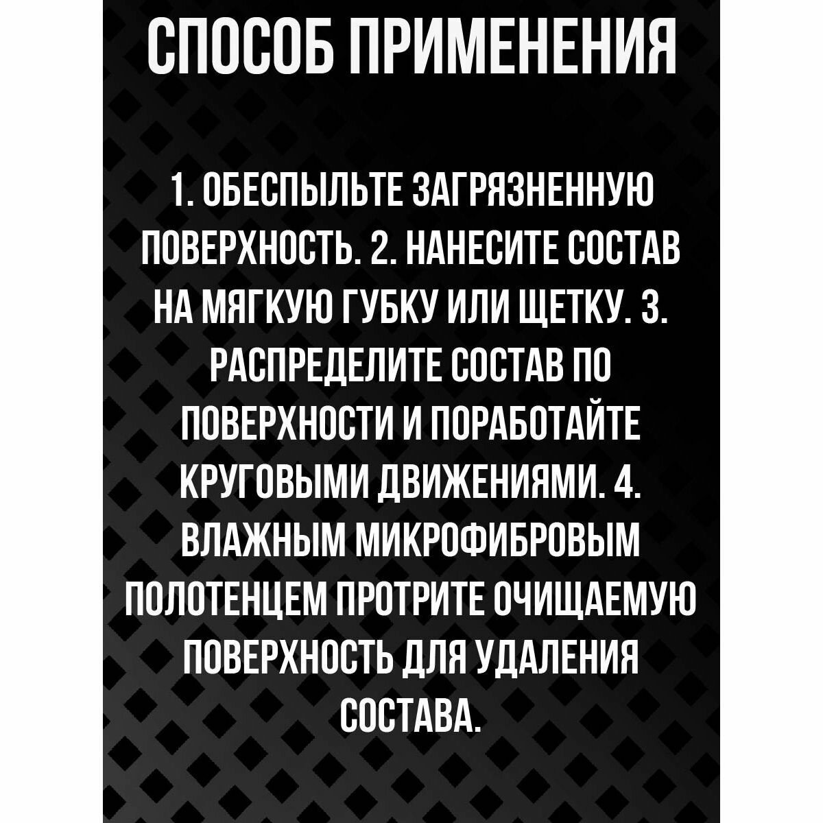 | Способ применения | 1. Тщательно очистите поверхность при помощи универсальных очистителей, например, Ultra Clean. 2. Пропитайте микрофибровый аппликатор или микрофибровое полотенце составом Plastic. 3. Равномерно распределите состав по обрабатываемой поверхности. 4. Дайте составу впитаться в течение 30-60 секунд, после чего уберите излишки состава микрофибровым полотенцем. |