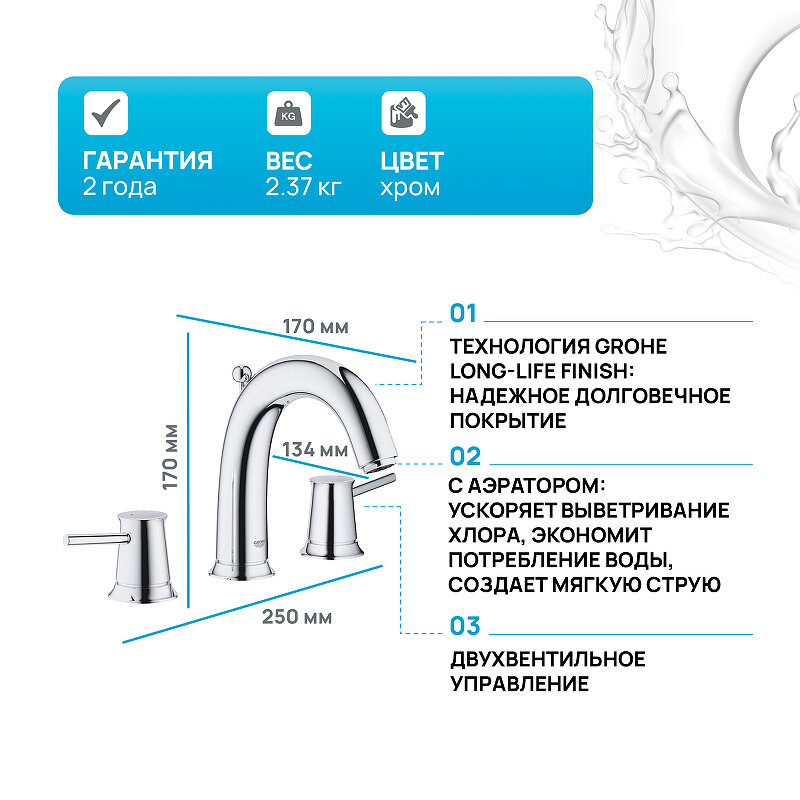Смеситель для раковины Grohe BauClassic, двухвентильный, на 3 отверстия, хром 20470000