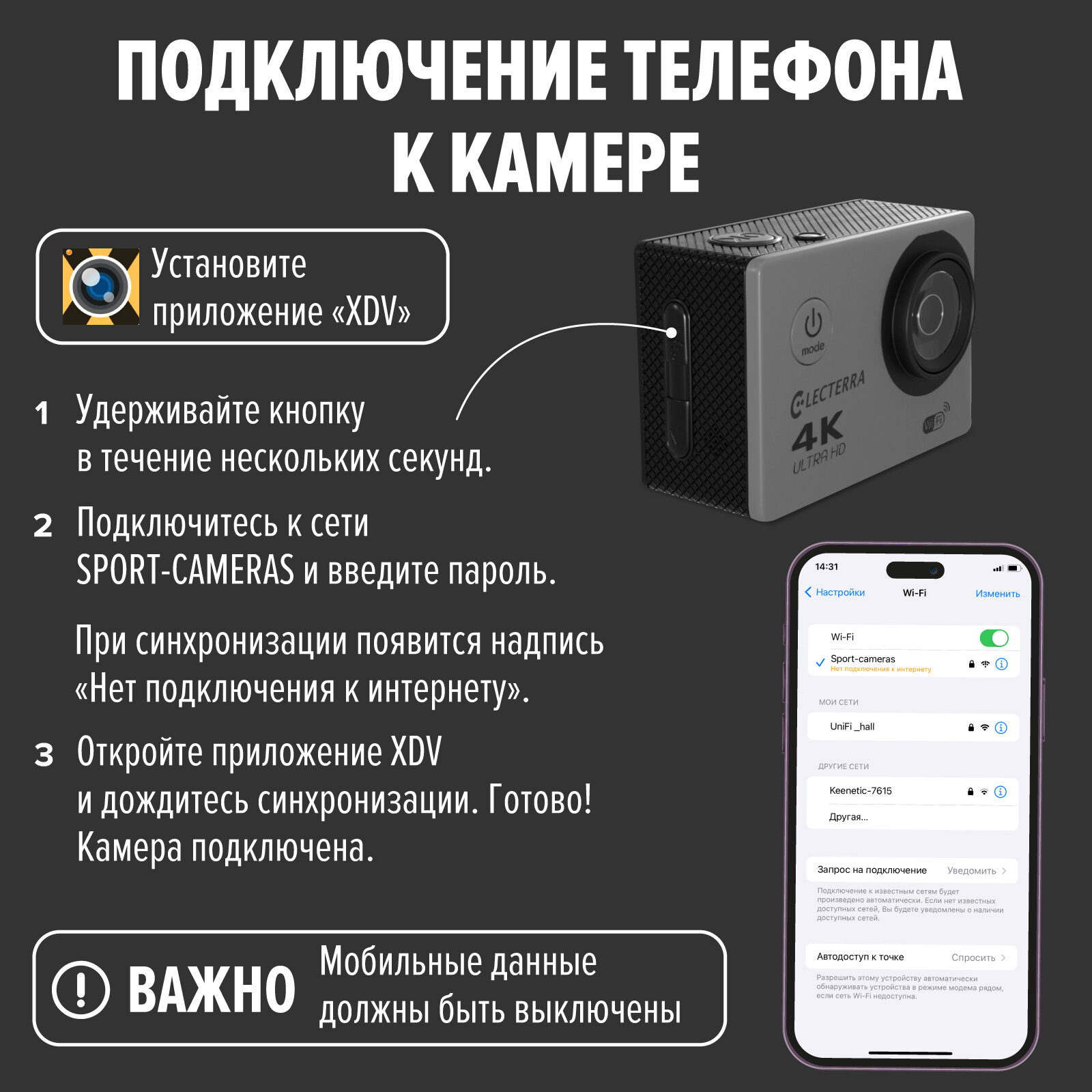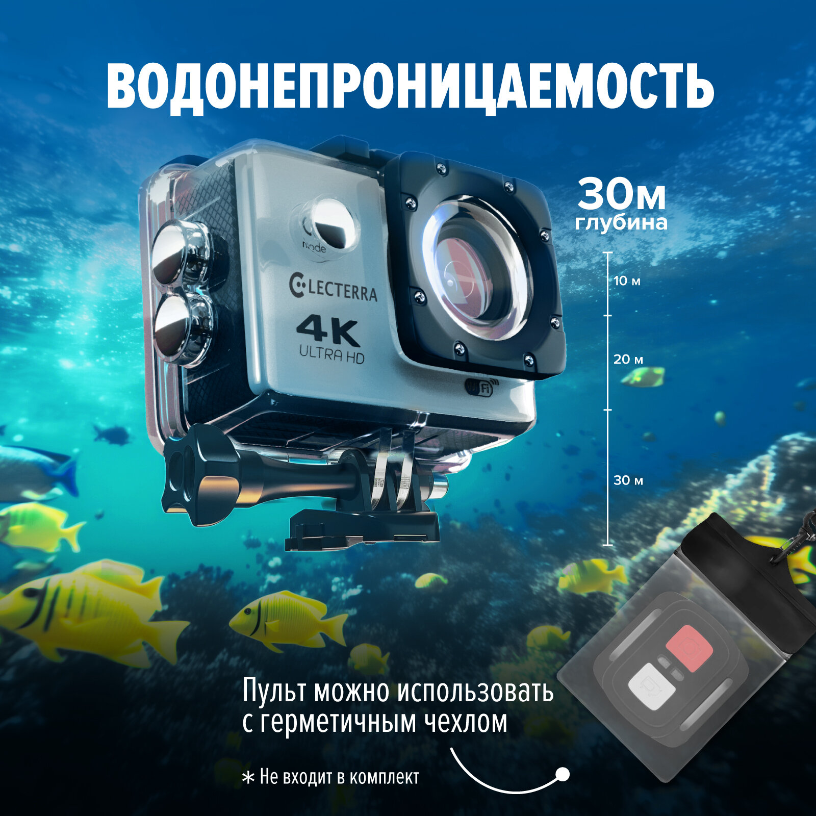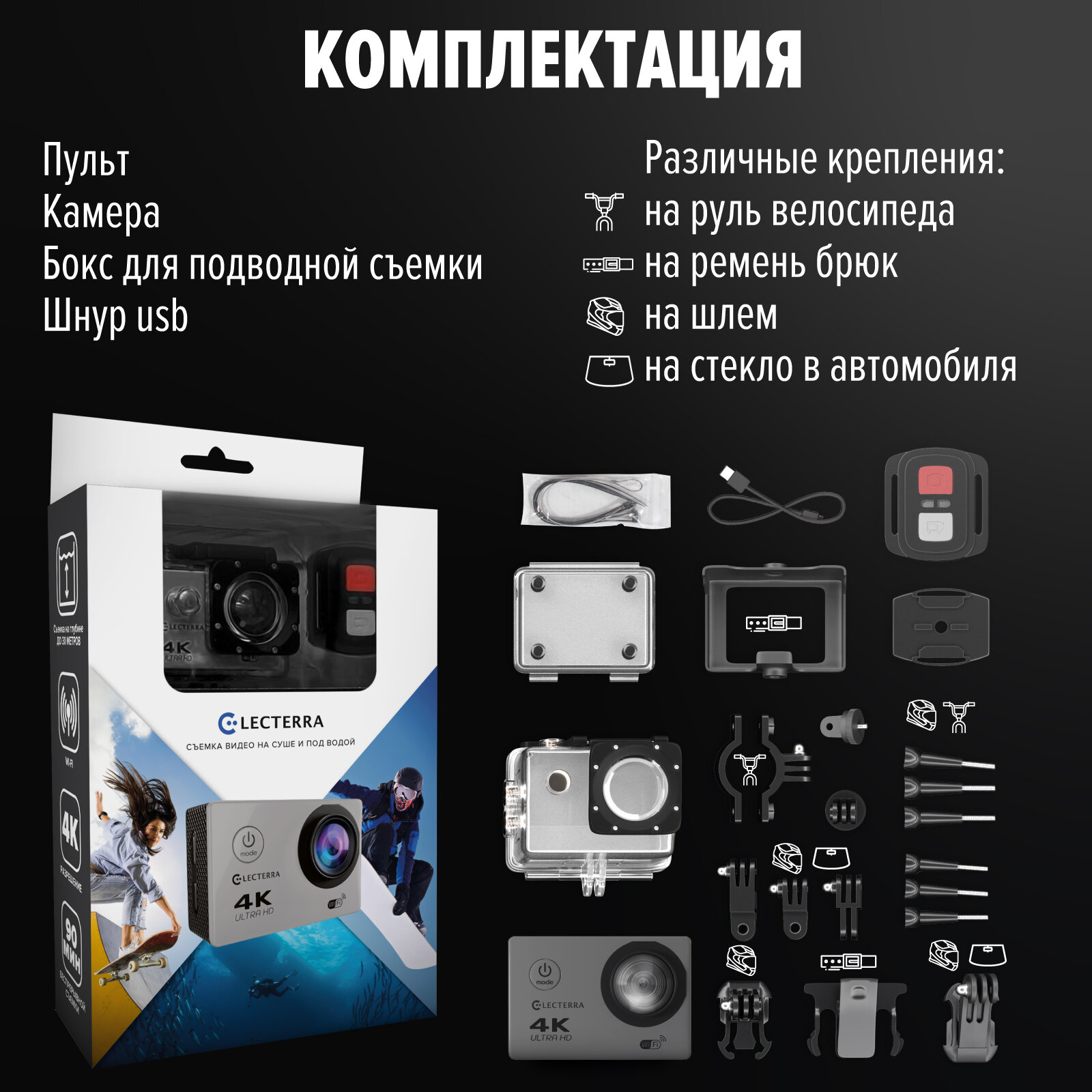 Экшен камера Electerra 4К UHD. Экшн камера Electerra 4К, набор креплений, аквабокс, wi-fi, пульт ДУ, серая интересное: