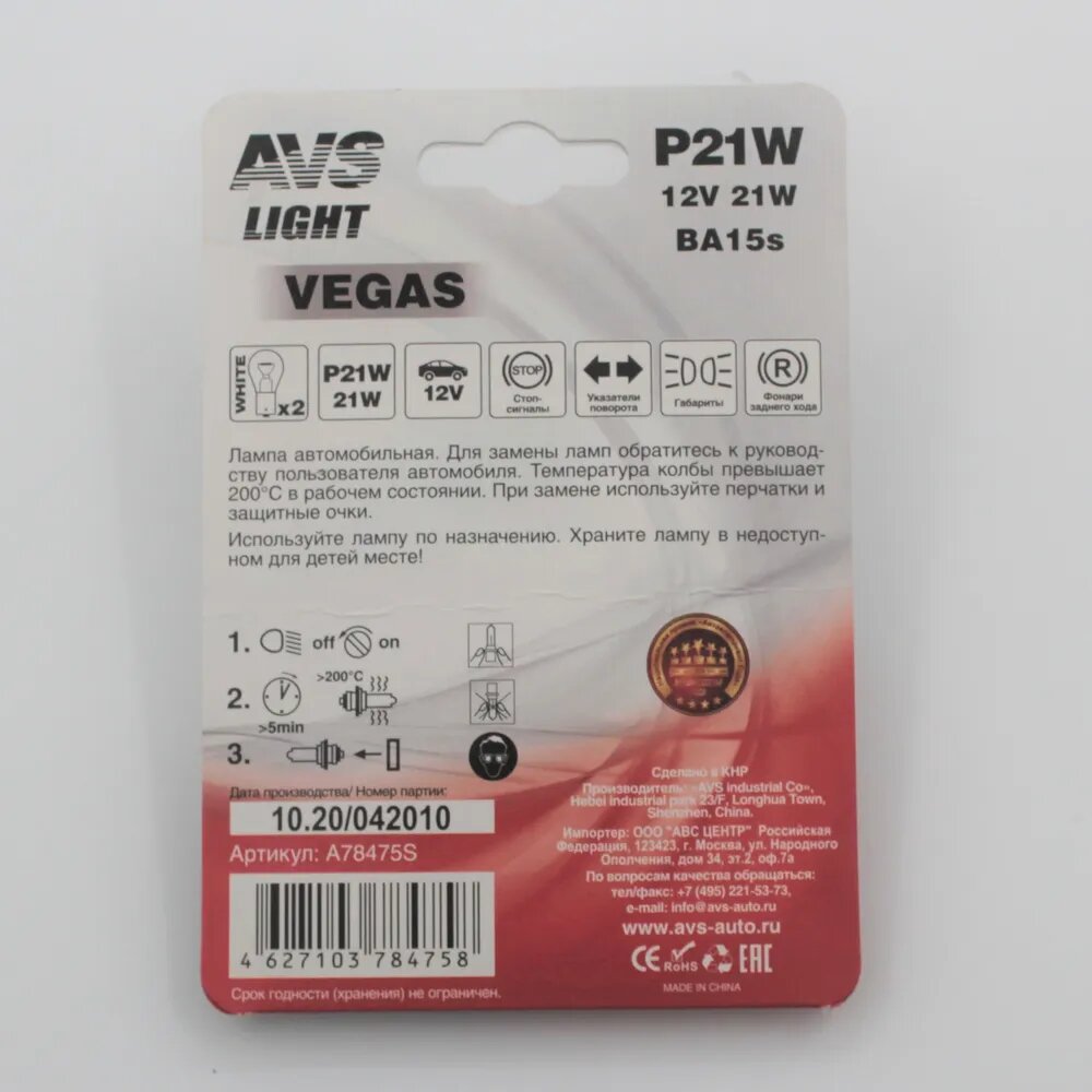 Лампа Avs Vegas В Блистере 12V. P21w(Ba15s) 2Шт. AVS арт. A78475S