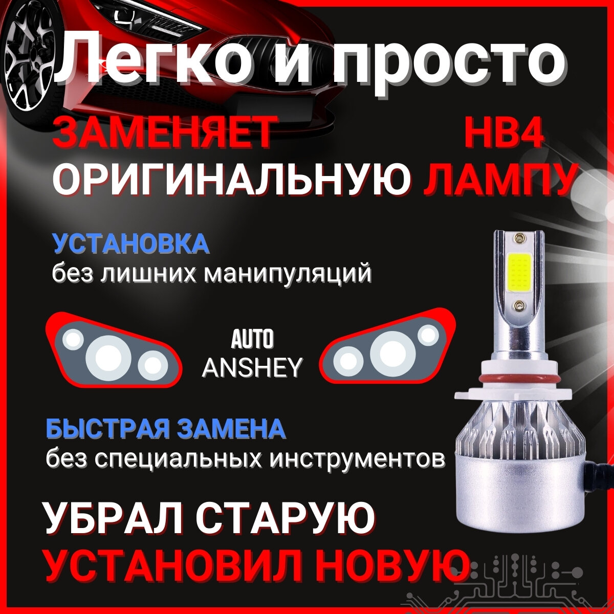 | Дополнительная информация | Лампы светодиодные 2 штуки - HB4 9006, H1, H7,H8, H9, H11, H4, H3, HB3 |