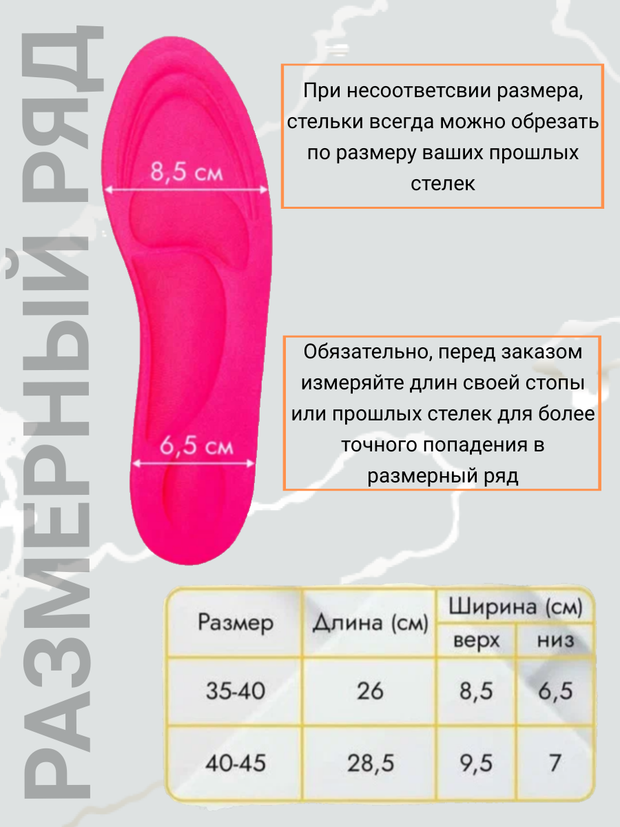 Ниже Вы можете прочитать отзывы на Стельки для обуви, анатомические, с ортопедическим эффектом памяти, мягкие, при плоскостопии, р-р 35-39, розовые, ознакомится с подробными характеристиками, посмотреть интересные обзоры и фотографии на Стельки для обуви, анатомические, с ортопедическим эффектом памяти, мягкие, при плоскостопии, р-р 35-39, розовые.