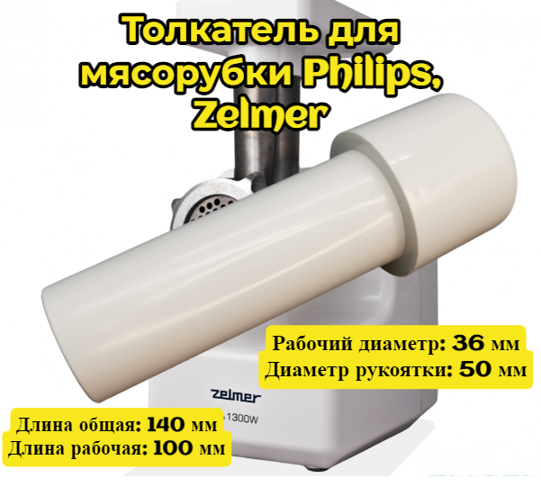 Толкатель для мясорубки Philips, Zelmer Длина общая: 140 мм Длина рабочая: 100 мм Рабочий диаметр: 36 мм Диаметр рукоятки: 50 мм интересное: