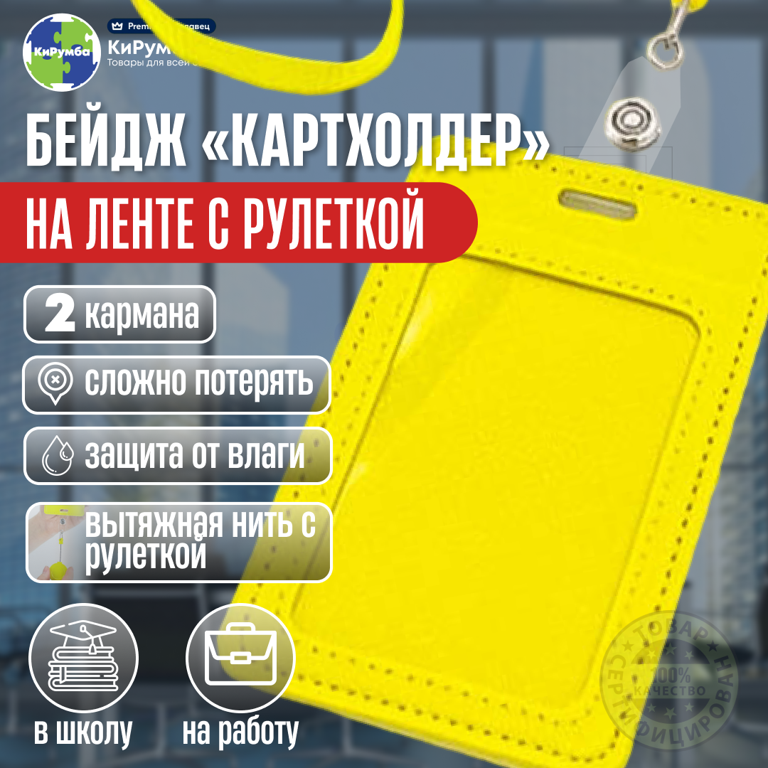 Купить Бейдж для пропуска, картхолдер, с рулеткой и лентой, желтый, 65x110 мм