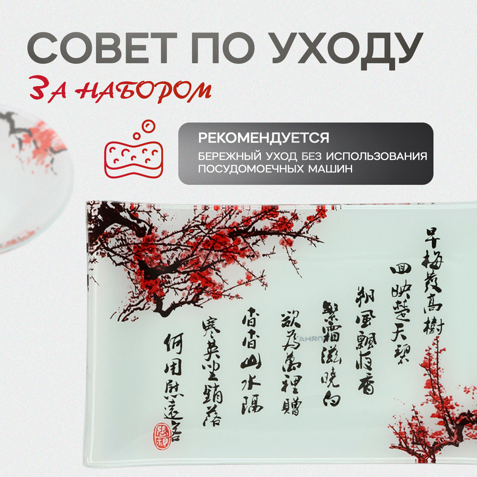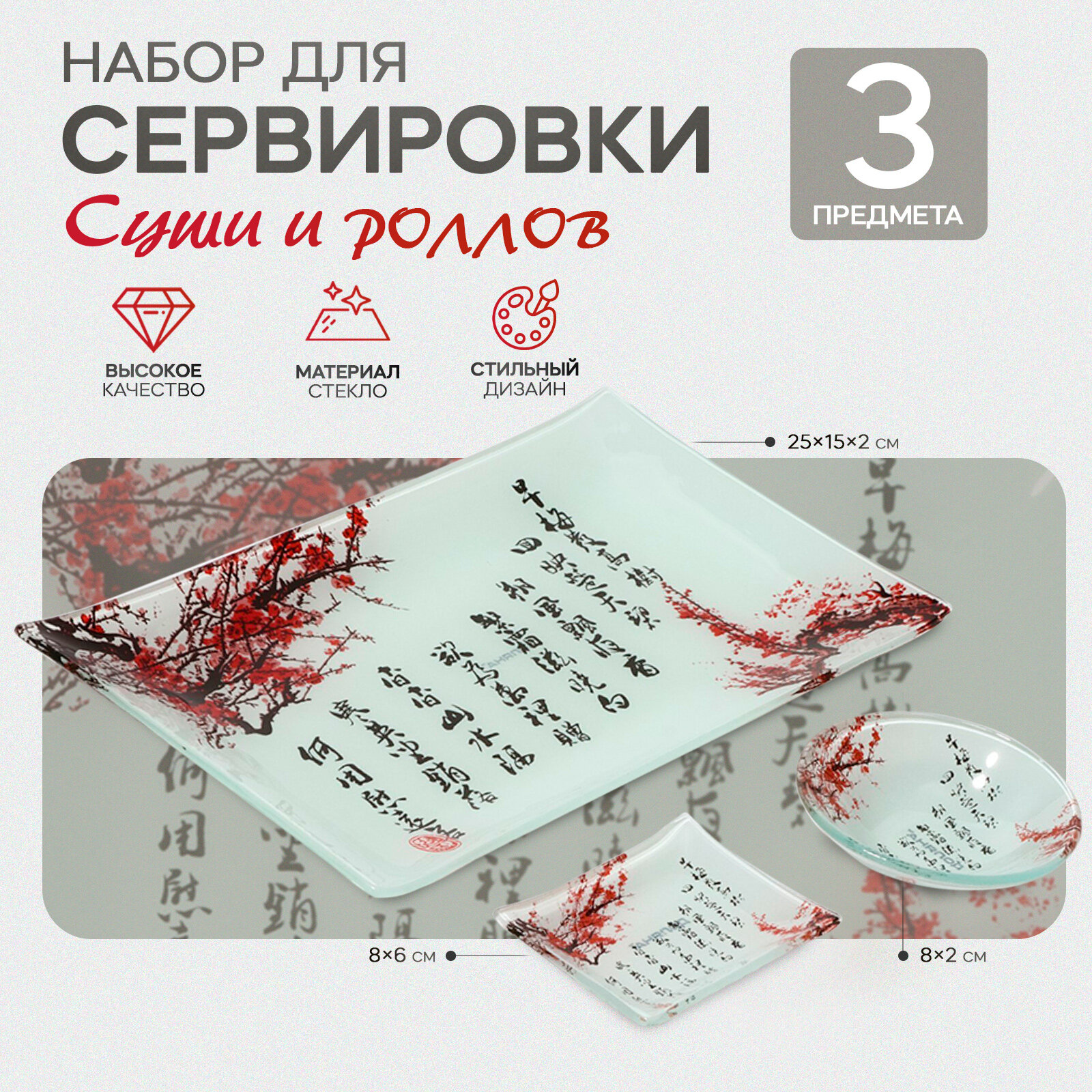 Купить Набор для суши из стекла Доляна «Сакура», 3 предмета: соусники 8×2 см, 8×6 см, подставка 25×15 см
