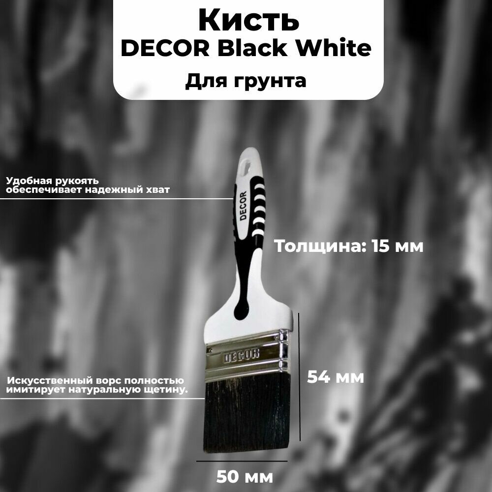 Малярная кисть DECOR плоская для грунта 50 мм черная-белая синтетическая щетина, длина щетины 54 мм, пластиковая противоскользящая ручка