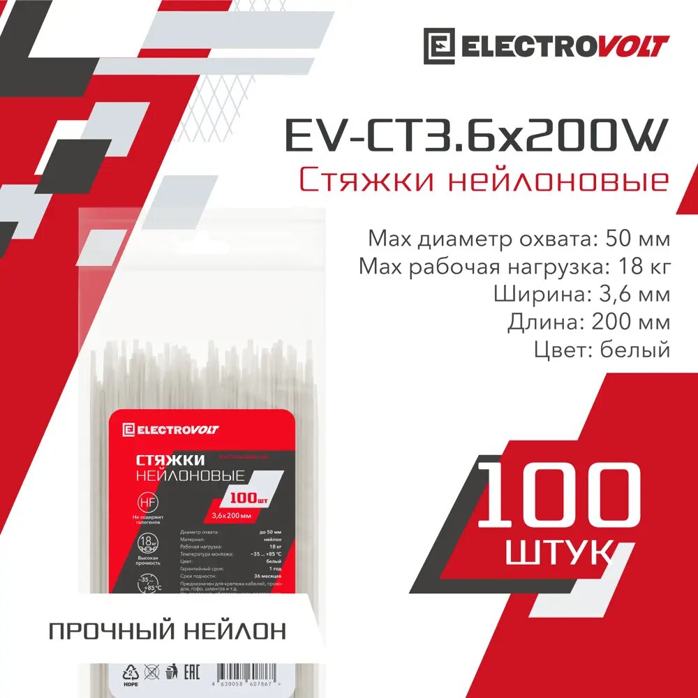 Нейлоновая стяжка ELECTROVOLT, 3,6 х 200 мм, 100 штук в упаковке, белая
