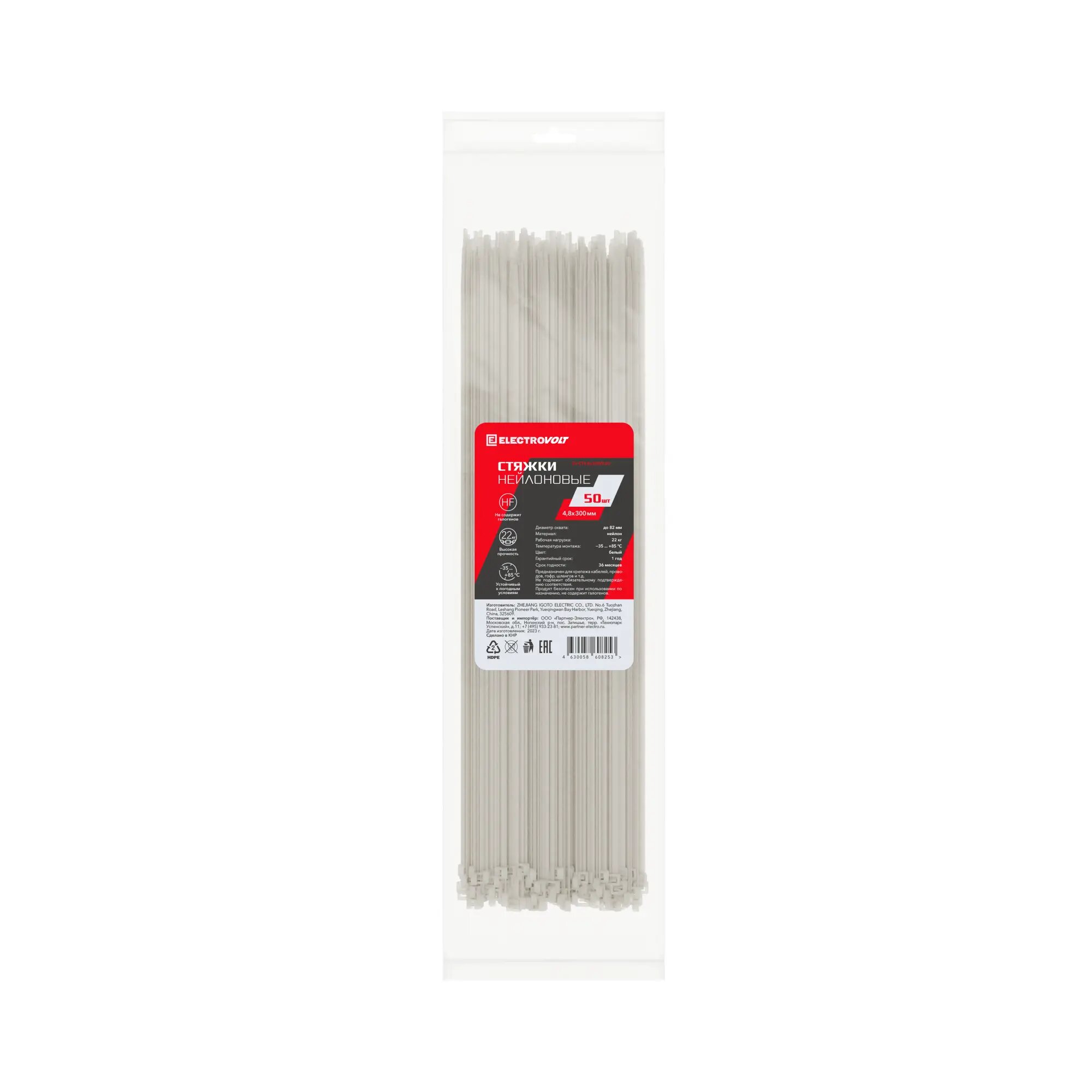 Нейлоновая стяжка ELECTROVOLT, 4,8 x 250 мм, 50 штук в упаковке, белая