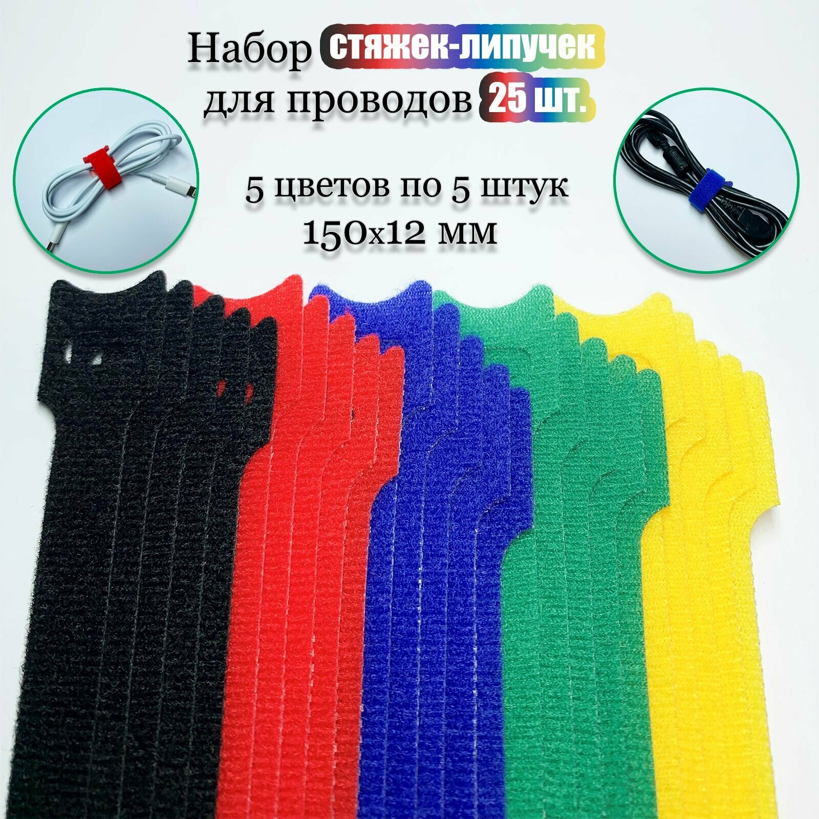 Купить Многоразовая стяжка-липучка для проводов и кабелей 150х12 мм. Цветная. 25 шт.