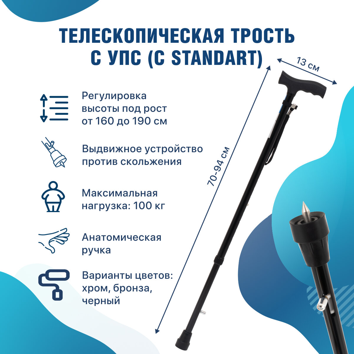 Трость опорная для ходьбы телескопическая C Standart с УПС (устройство против скольжения) для взрослых, пожилых людей и инвалидов