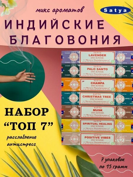 Ароматические палочки / топ набор 7 упаковок / Satya / арома благовония индийские