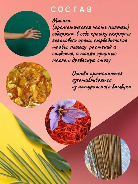 | Состав | эфирные масла - 20%, порошок из скорлупы кокосового ореха - 25%, сахарный сироп - 10%, порошок смолы - 10%, пудровый порошок - 10%, бамбуковая палочка - 25% |
