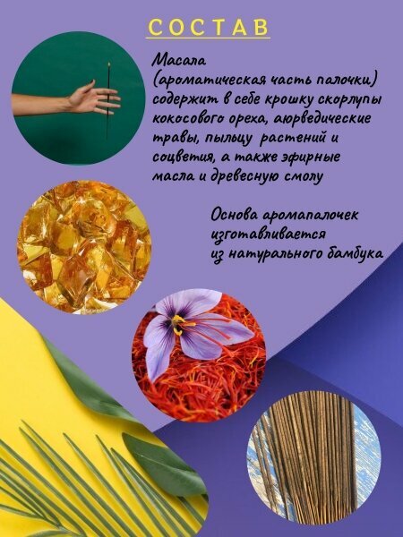 | Состав | эфирные масла - 20%, порошок из скорлупы кокосового ореха - 25%, сахарный сироп - 10%, порошок смолы - 10%, пудровый порошок - 10%, бамбуковая палочка - 25% |
