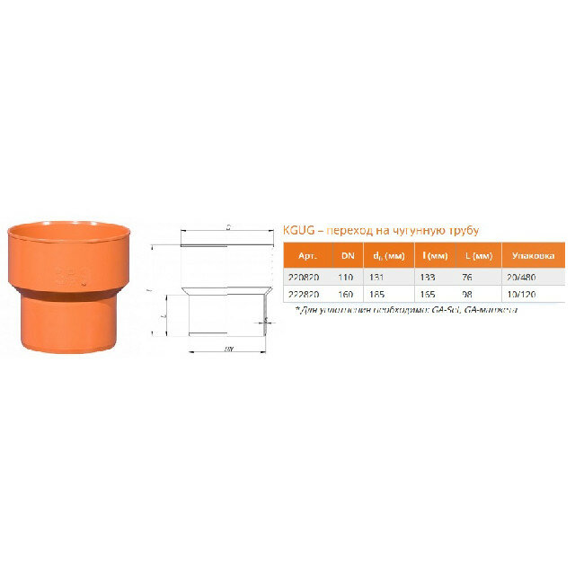 | Дополнительная информация | переход на чугунную трубу (для уплотнения необходимо: GA-Set, GA-манжета); коэффициент линейного расширения - 8*10^(-5) °C^(-1) |