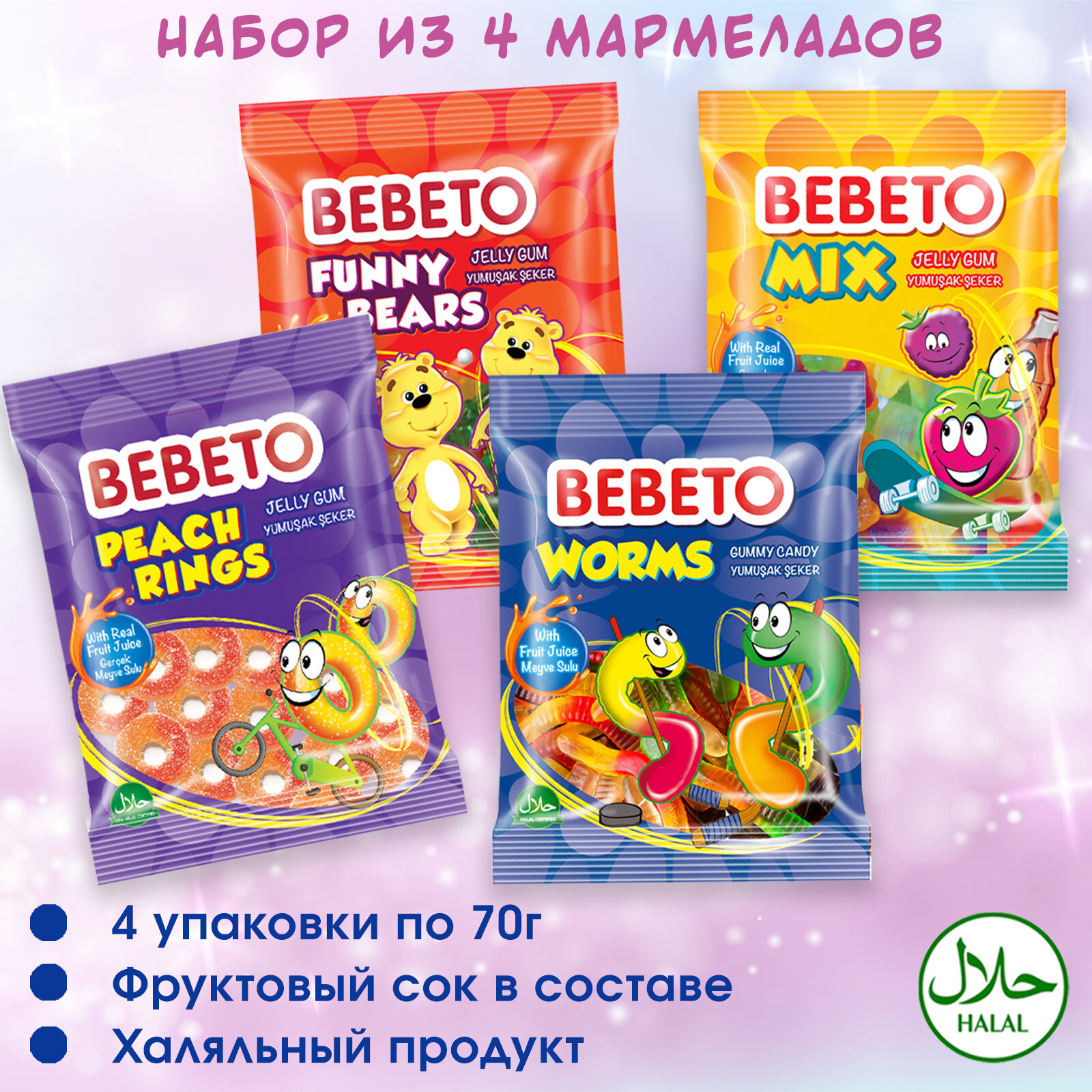 Купить Мармелад жевательный Турция Ассорти "Funny Bears, Mix, Worms, Peach Rings" Bebeto, 280 грамм.