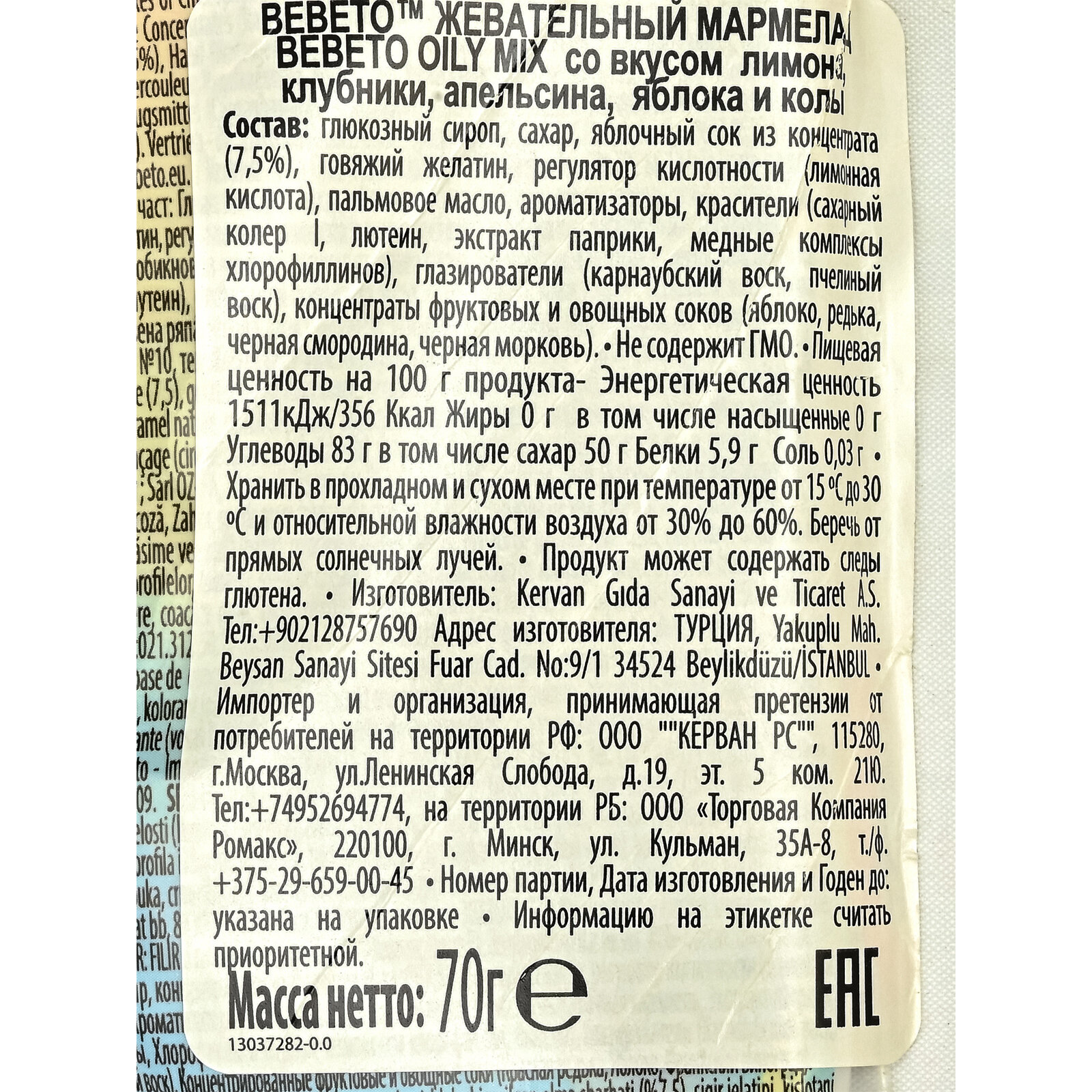 | Состав | Глюкозный сироп, сахар, говяжий желатин, кукурузный крахмал, регулятор кислотности (лимонная кислота), кислоты ( винная кислота, яблочная кислота), ароматизатор, концентраты фруктовых и овощных соков (черная морковь, яблоко, редька, черная смородина), красители (лютеин, экстракт паприки). |