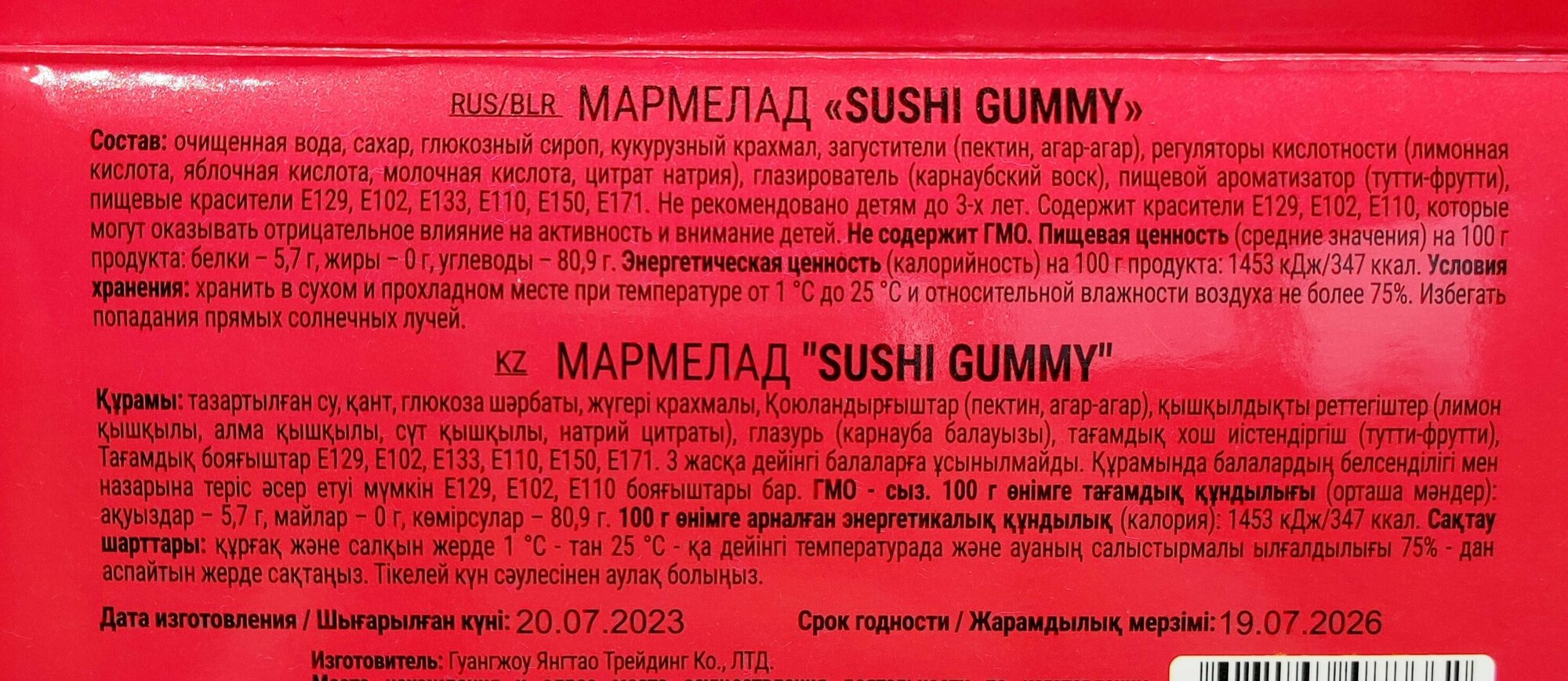 | Состав | очищенная вода, сахар, глюкозный сироп, кукурузный крахмал, пектин, агар-агар, лимонная кислота, яблочная кислота, молочная кислота, карнаубский воск, пищевой ароматизатор, пищевые красители Е129,102,133,110,150,171 |