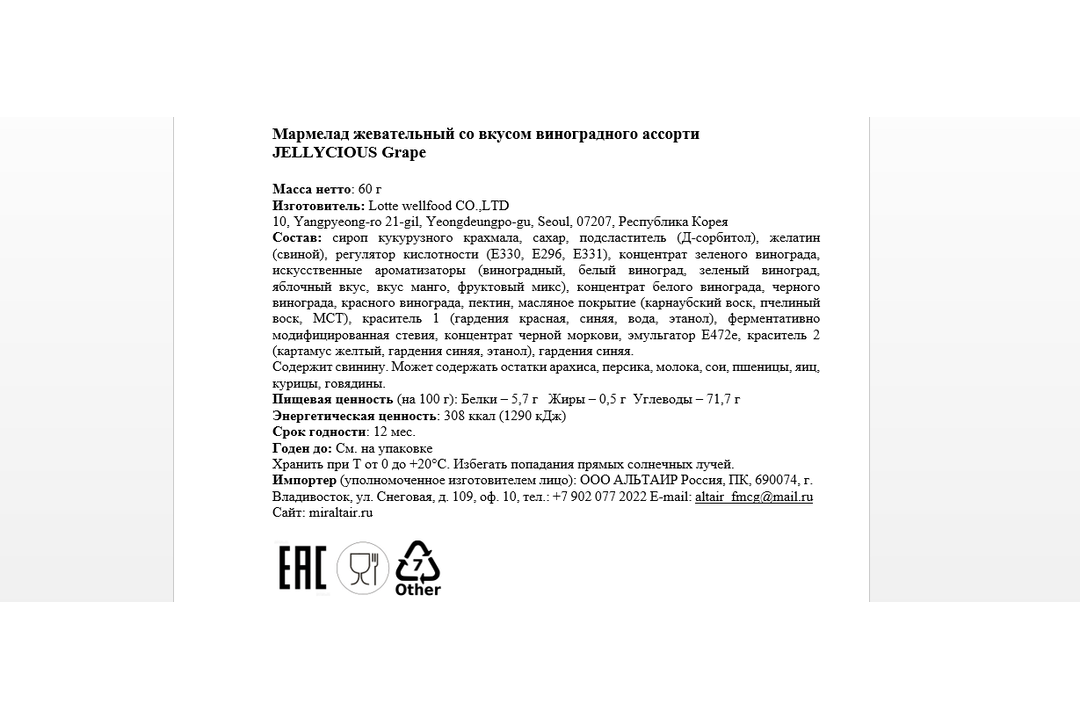 | Состав | сахар,сироп из кукурузного крахмала,концентрированный сок зеленого винограда,желатин,сорбит,регулятор кислотности(лимонная кислота(Е330)),ароматизаторы(аромат зеленого винограда,фруктовый микс),пектин,обработанное масло(триглицериды со средней цепью,карнаубский воск,белый пчелиный воск),красители природного происхождения,регулятор кислотности(цитрат натрия(Е331)),эмульгатор(сложные эфиры жирных кислот глицерина) |