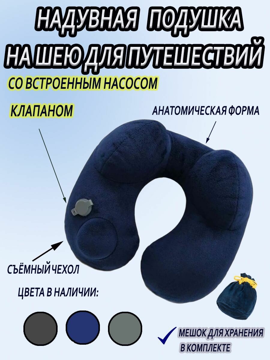 Надувная подушка для путешествий на шею с клапаном встроенного насоса / туристическая, в самолёт, дорожная / интересное: