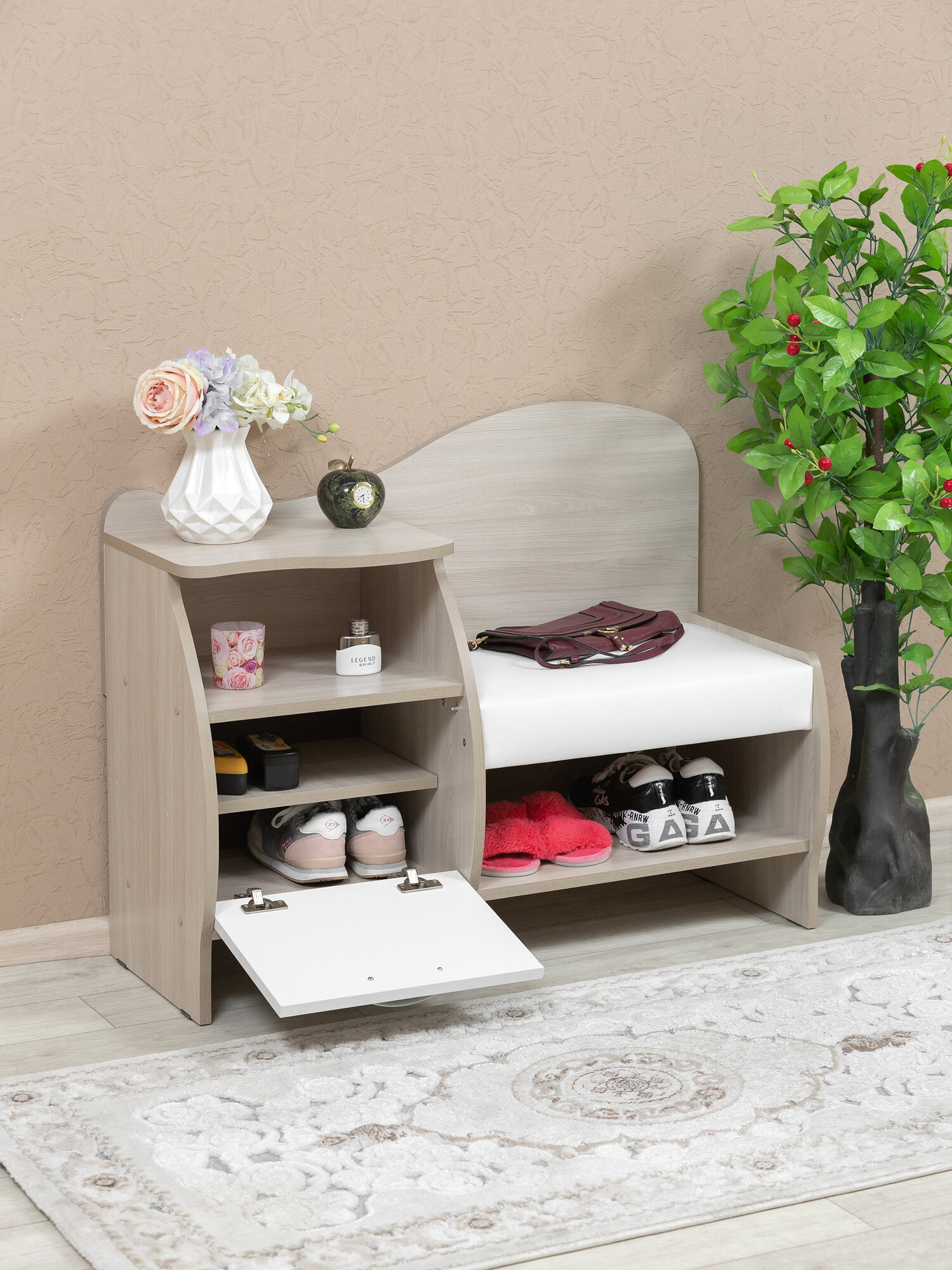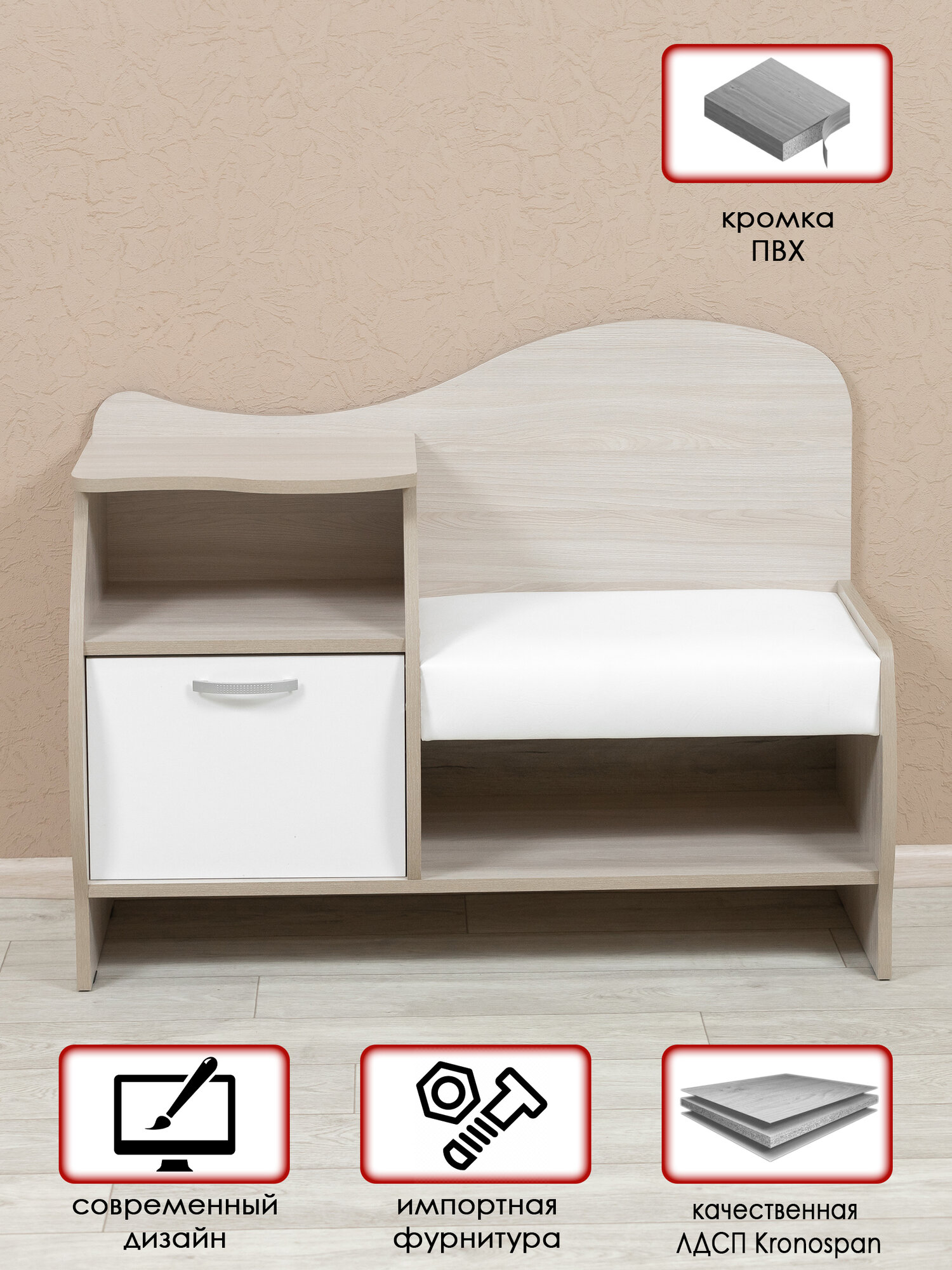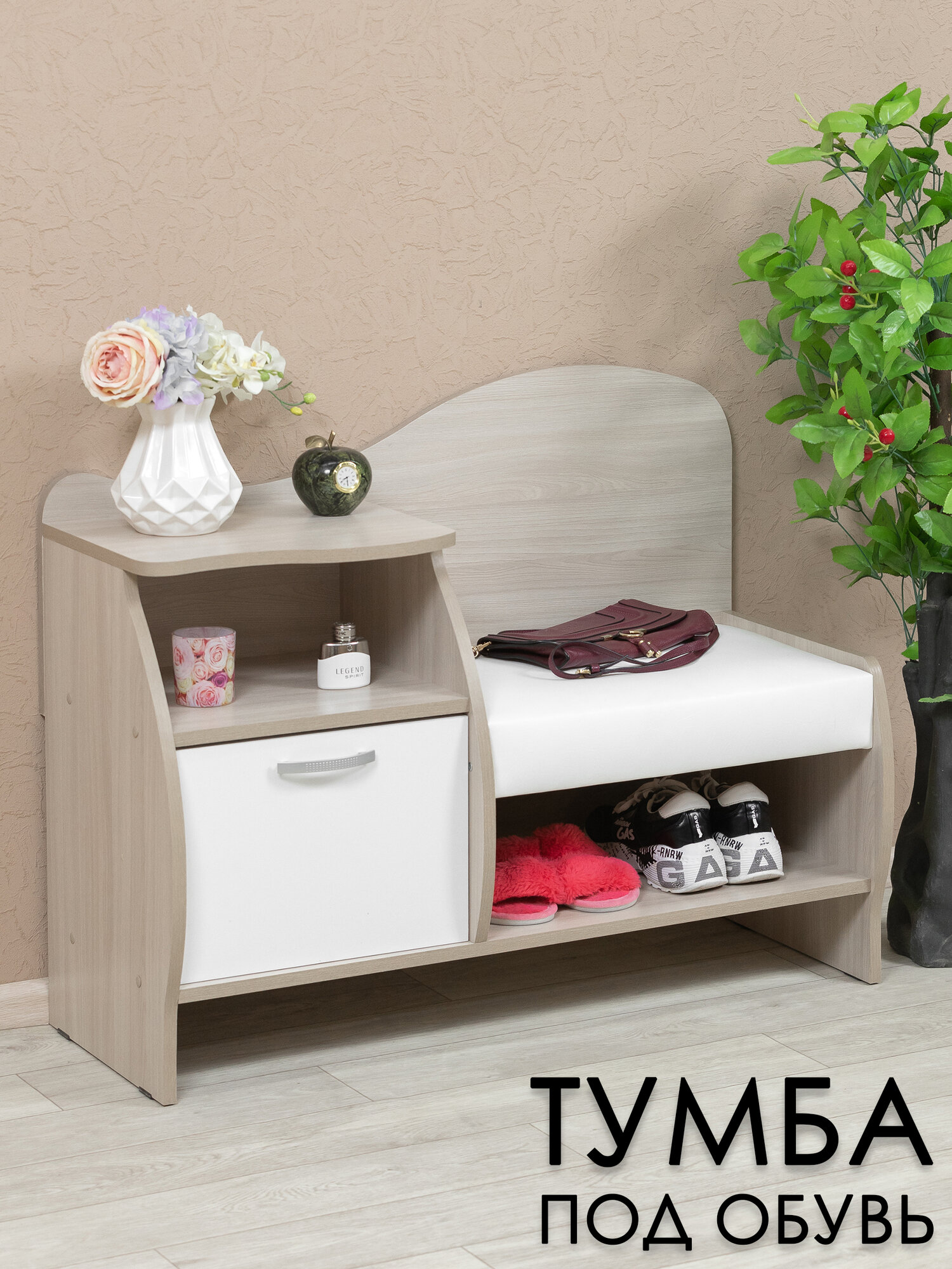 Тумба для обуви в цвете ясень шимо светлый, обувница с мягким сиденьем. Мебельная фабрика лена