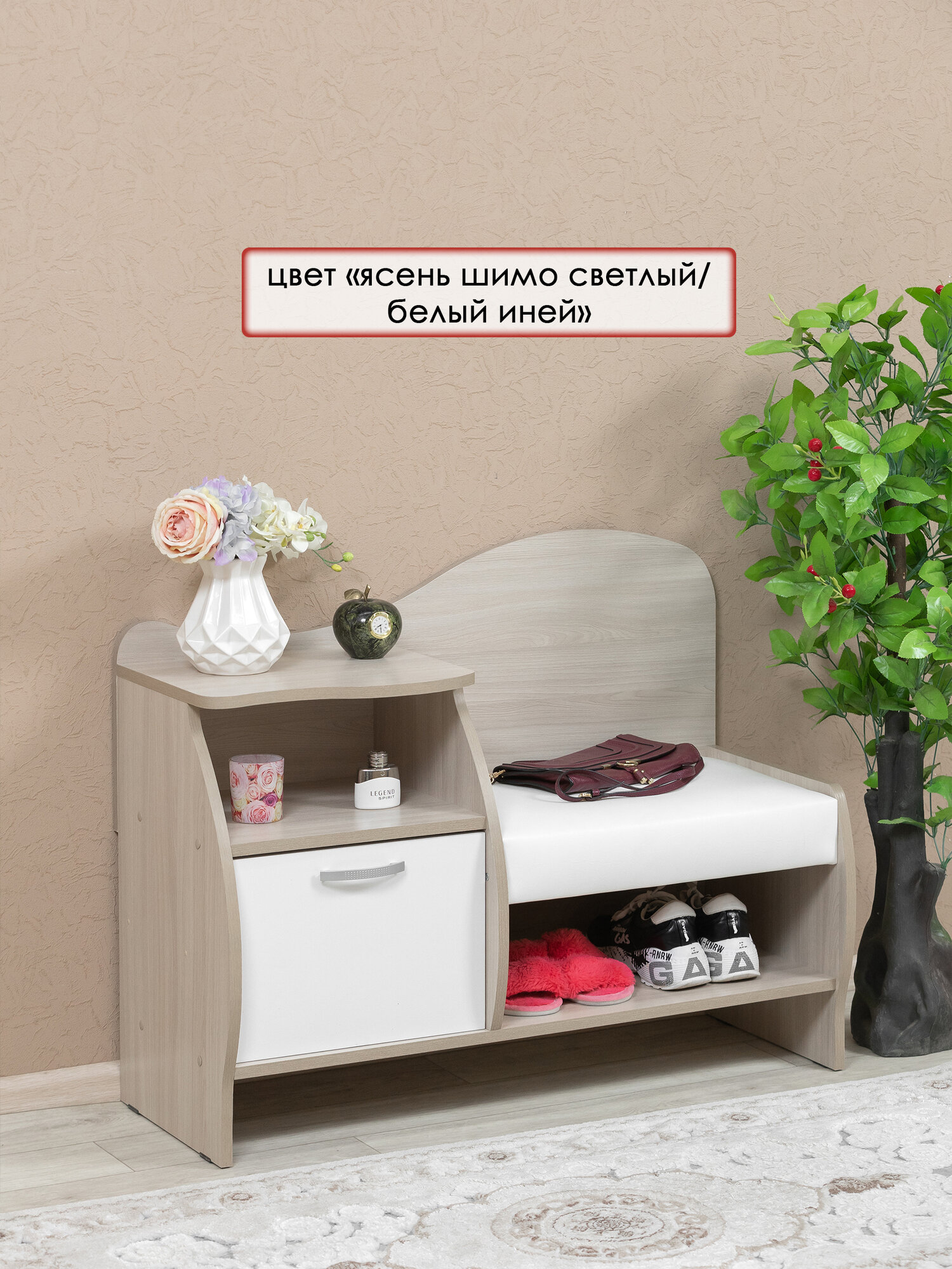 Тумба для обуви в цвете ясень шимо светлый/белый, обувница с мягким сиденьем. Мебельная фабрика лена интересное: