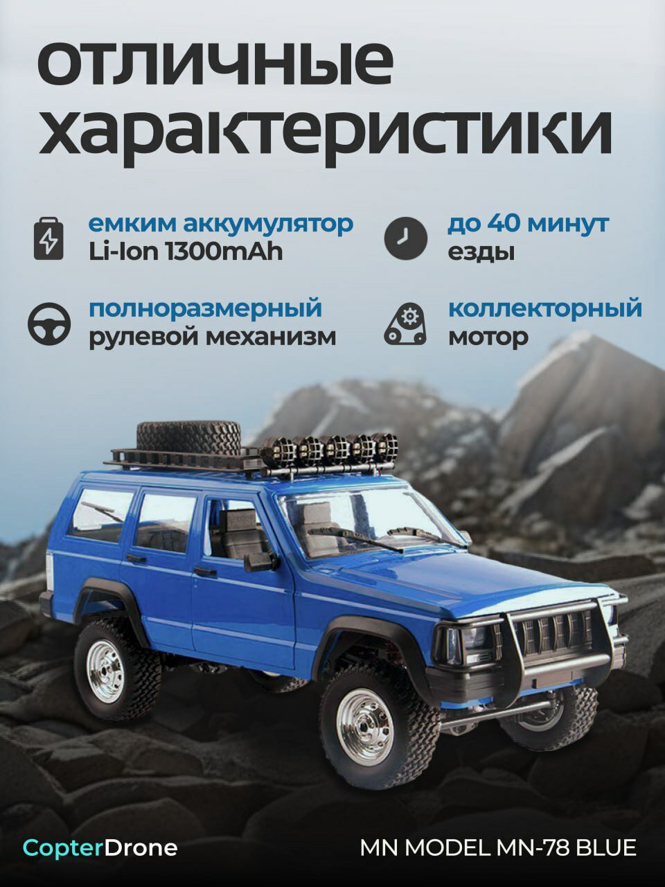 Ниже Вы можете прочитать отзывы на Радиоуправляемая машина джип MN MODEL CHEROKEE (серый) RTR 4WD масштаб 1:12 2.4G - MN-78 BLUE, ознакомится с подробными характеристиками, посмотреть интересные обзоры и фотографии на Радиоуправляемая машина джип MN MODEL CHEROKEE (серый) RTR 4WD масштаб 1:12 2.4G - MN-78 BLUE.