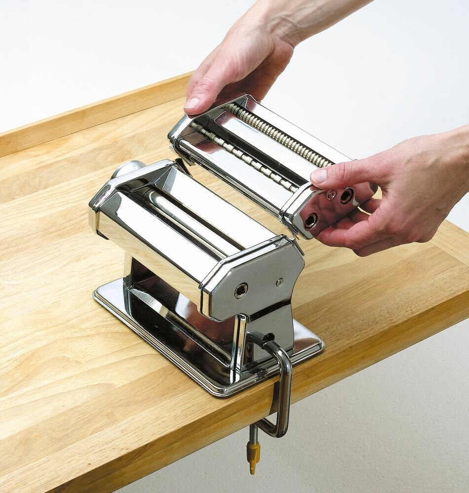 | Комплектация | Машина для работы с тестом, из хромированной стали с 3 различными роликами - идеально подходит для приготовления лазанья, спагетти и тальятелле - с ручным кривошипным приводом, идеальна для приготовления свежей домашней пасты. С креплением для фиксации на столе. |
