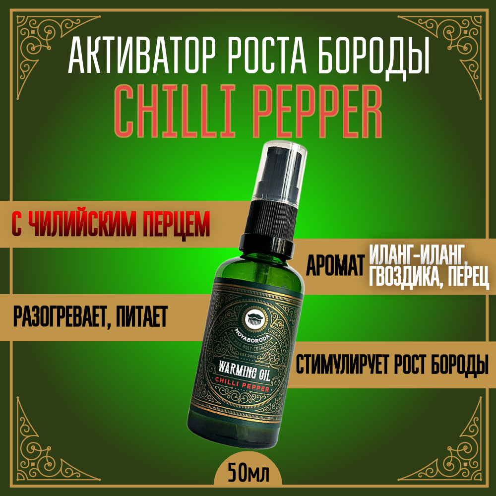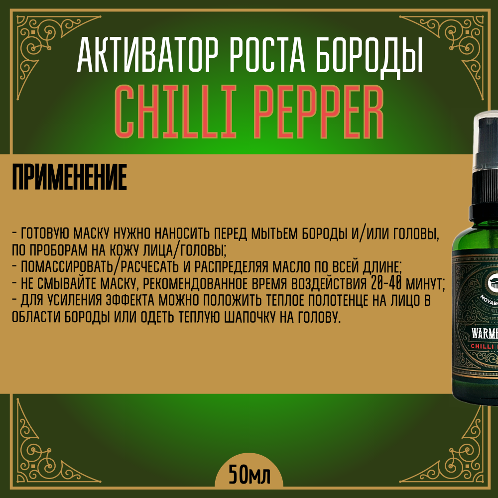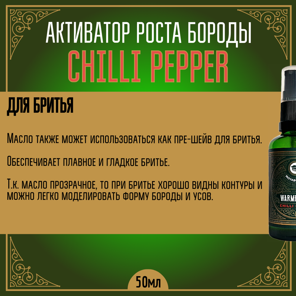 Активатор для роста волос, бороды, усов MOYABORODA "CHILLI PEPPER", прешейв для бритья (органик масло с Чилийским перцем). (50мл.) интересное: