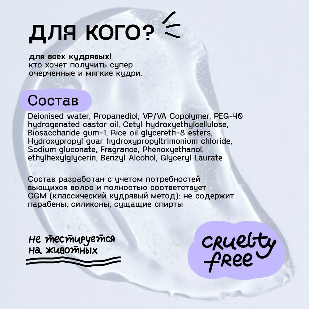 | Способ применения | Гель распределить по ладоням и, разглаживая по всей длине, нанести на очень влажные волосы. Мнущими движениями снизу вверх сформировать локоны. Высушить укладку феном с диффузором. Для создания прикорневого объема сушить кудри, опустив голову вниз. Образовавшийся каст разбить руками, а волосы встряхнуть. |