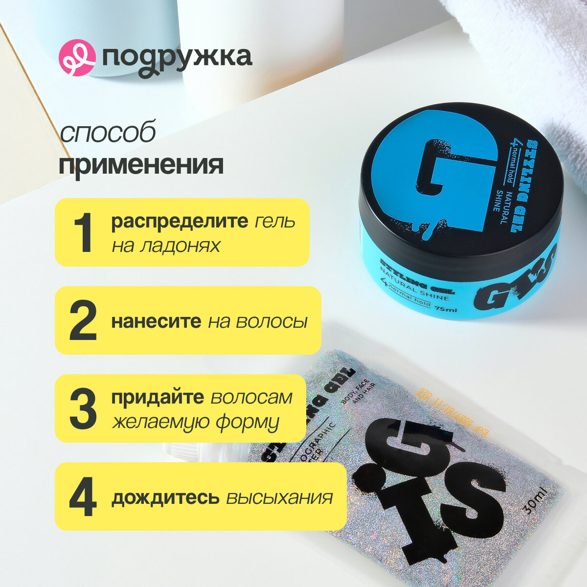 | Способ применения | Распределить необходимое количество геля на ладонях. Нанести гель на волосы. Придать волосам желаемую форму. |