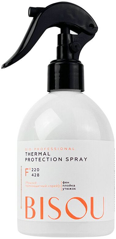 | Дополнительная информация | Эффективная защита волос от термических ударов до 220 градусов при использовании фена, утюжка, плойки благодаря термозащитному спрею Bisou! Комбинация термоустойчивых активов создает на волосах защитный барьер, защищая волос от перегревания. Удобный угол рассеивания позволяет эффективно распределять продукт. |