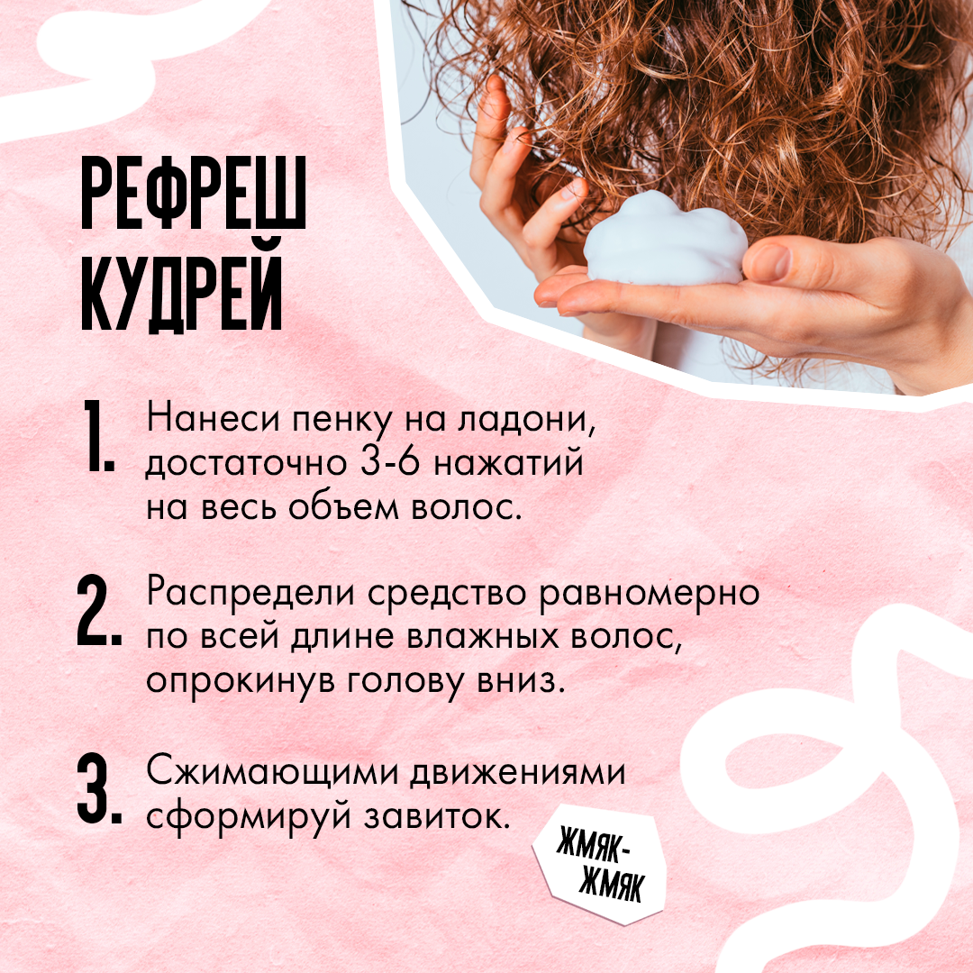 | Способ применения | нанесите пенку на ладони, распределите по волосам, не затрагивая корни, и высушите волосы привычным способом |