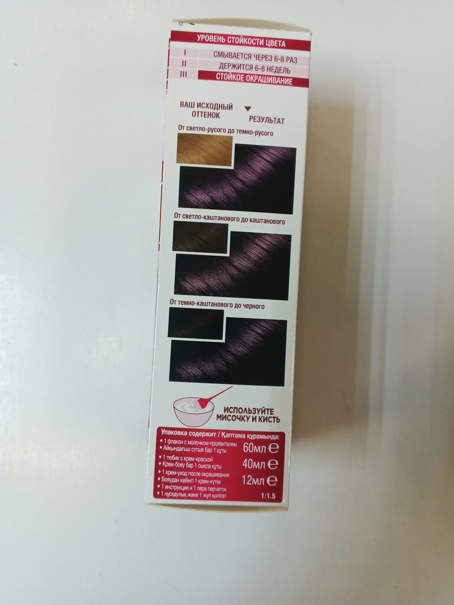 | Способ применения | мешайте крем-краску и молочко-проявитель. Нанесите на волосы. Подождите рекомендованное на упаковке время и смойте. Нанесите бальзам. Смойте. Для усиления защиты цвета от вымывания используйте шампунь для окрашенных волос |