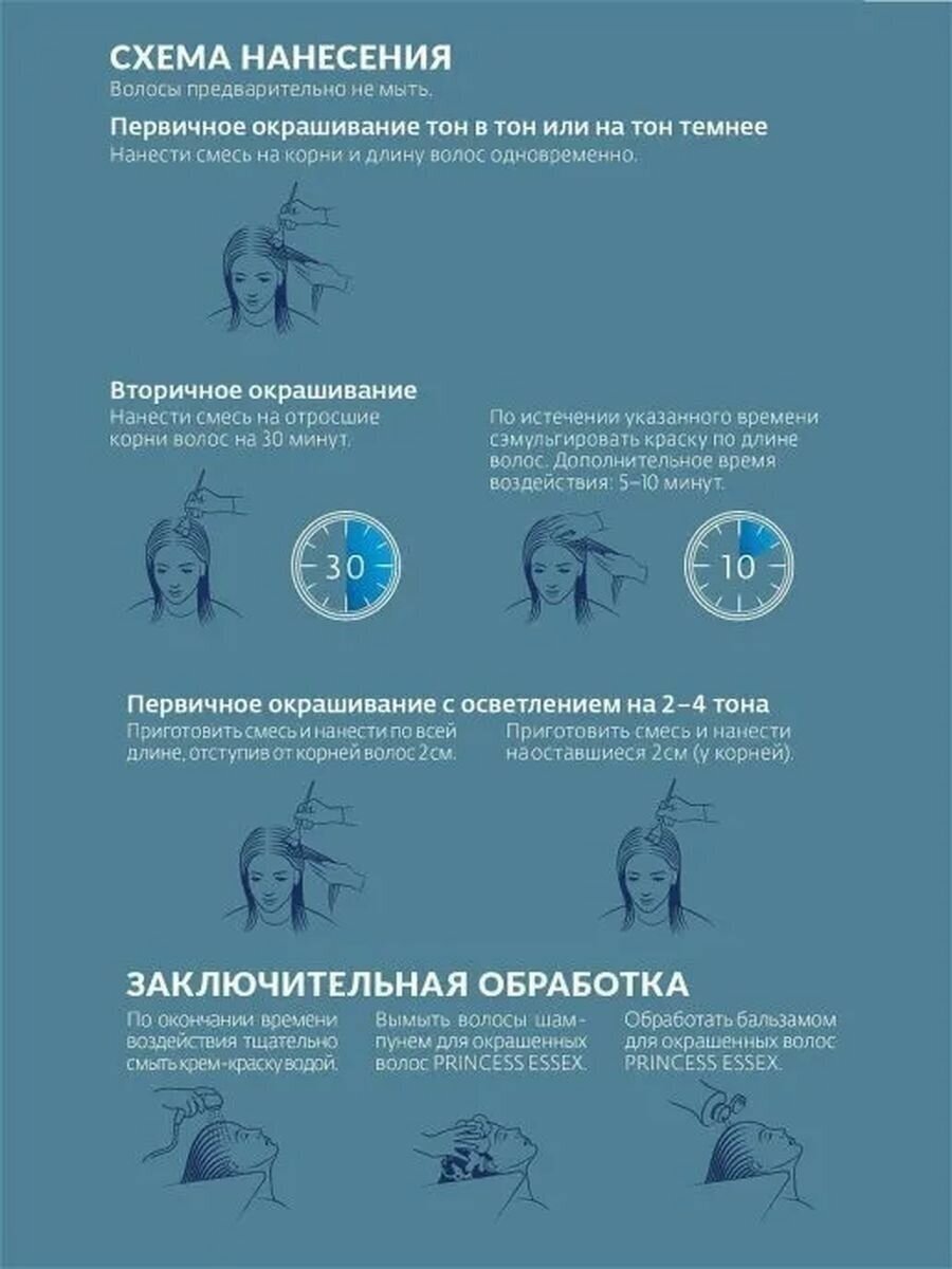 | Способ применения | смешивается с оксигентами PRINCESS ESSEX 3, 6, 9 % в соотношении 1:1 и с активатором PRINCESS ESSEX 1,5 % в соотношении 1:2 |