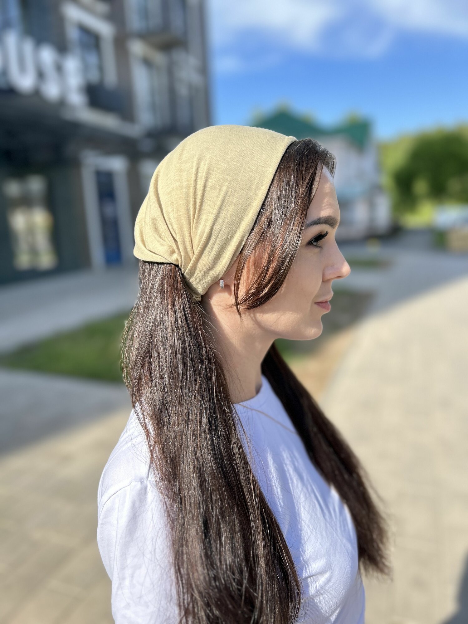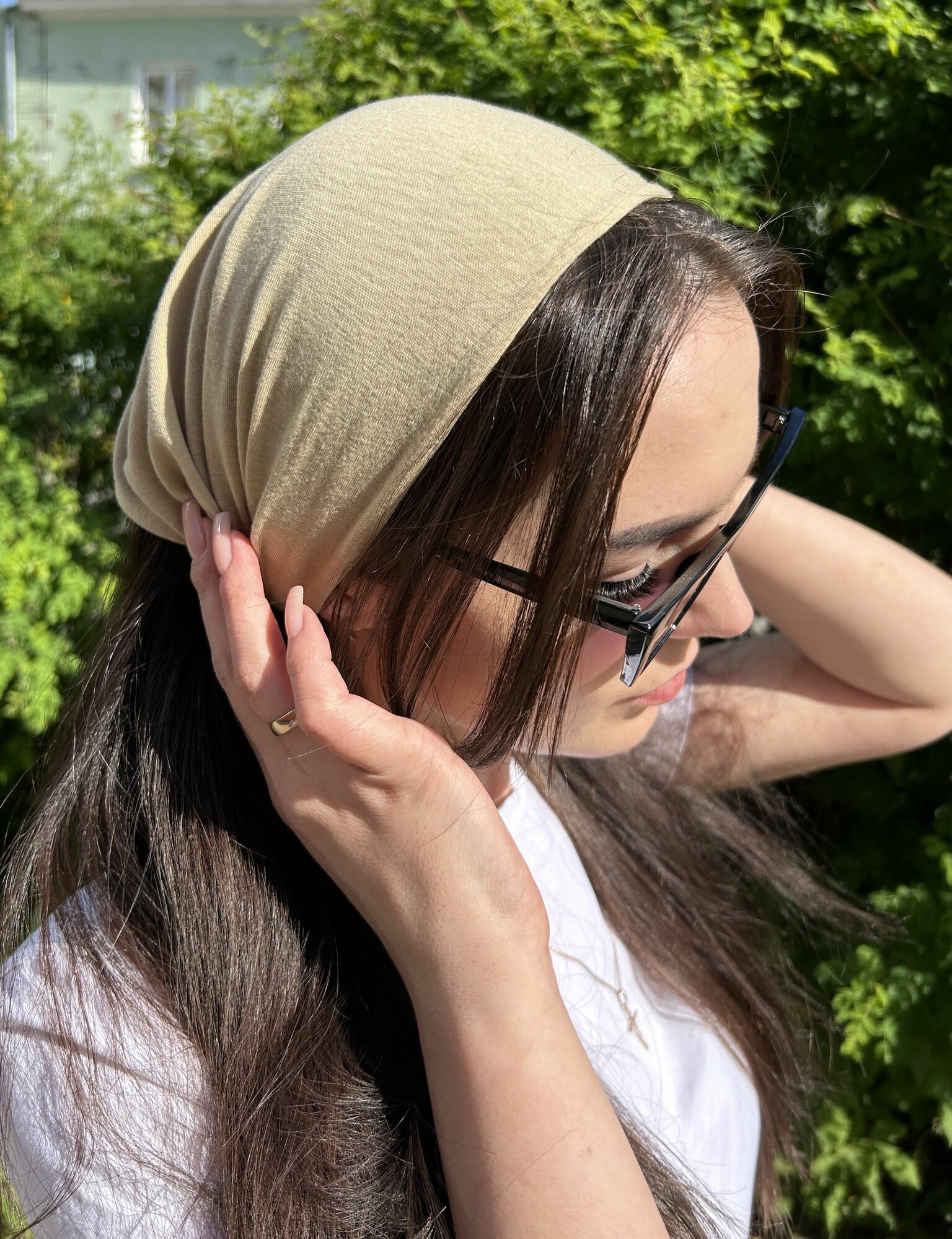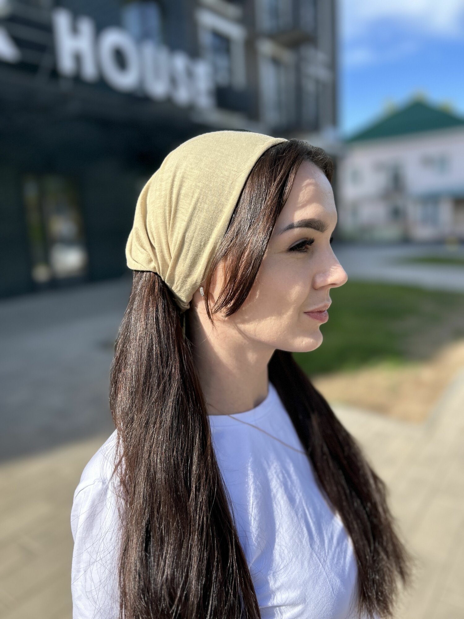Повязка бандана косынка на голову хлопковая бежевая однотонная эластичная на резинке интересное: