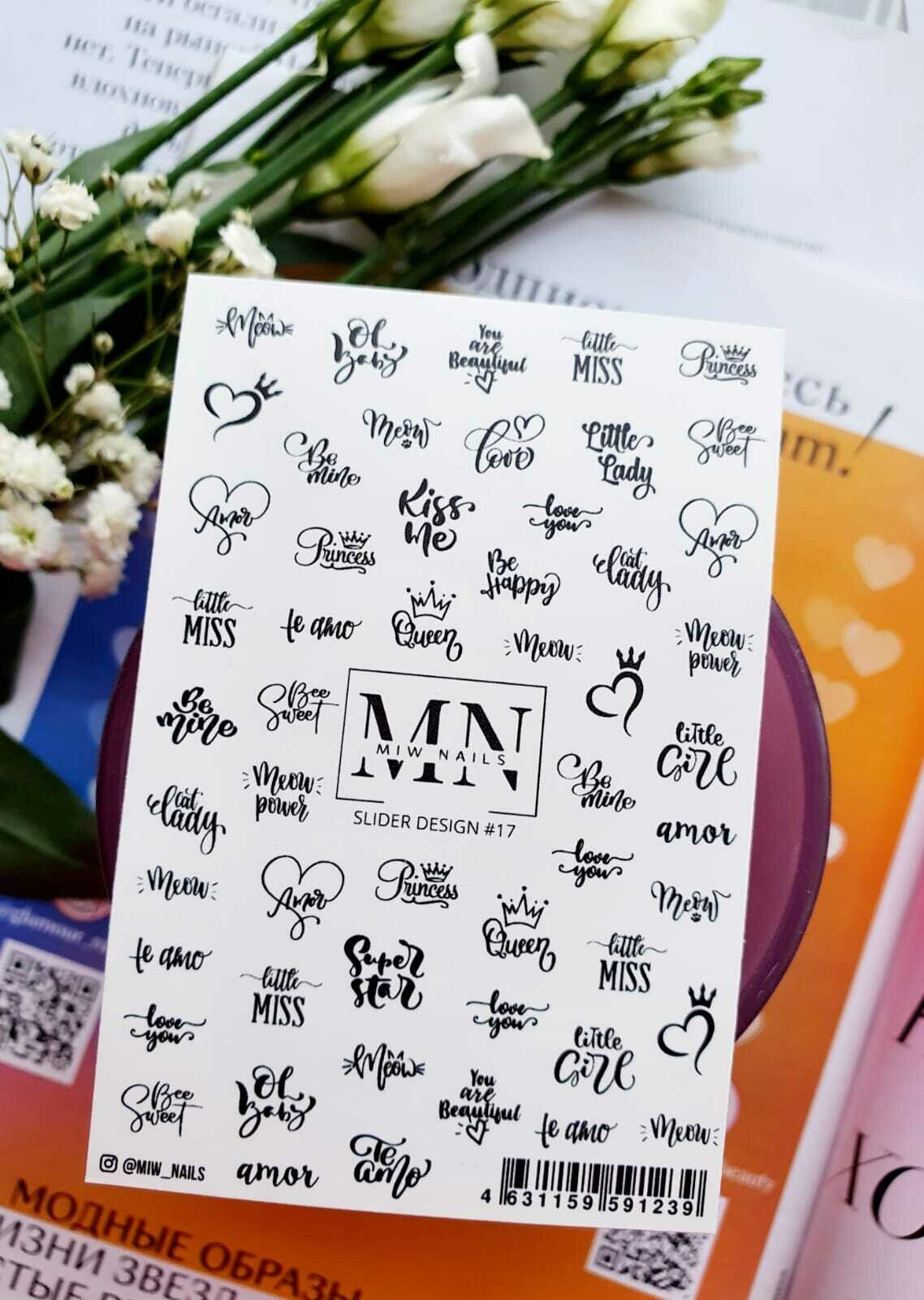 MIW Nails "Слайдеры для ногтей" водные наклейки для дизайна #17 черно-белый текст, слова, любовь интересное: