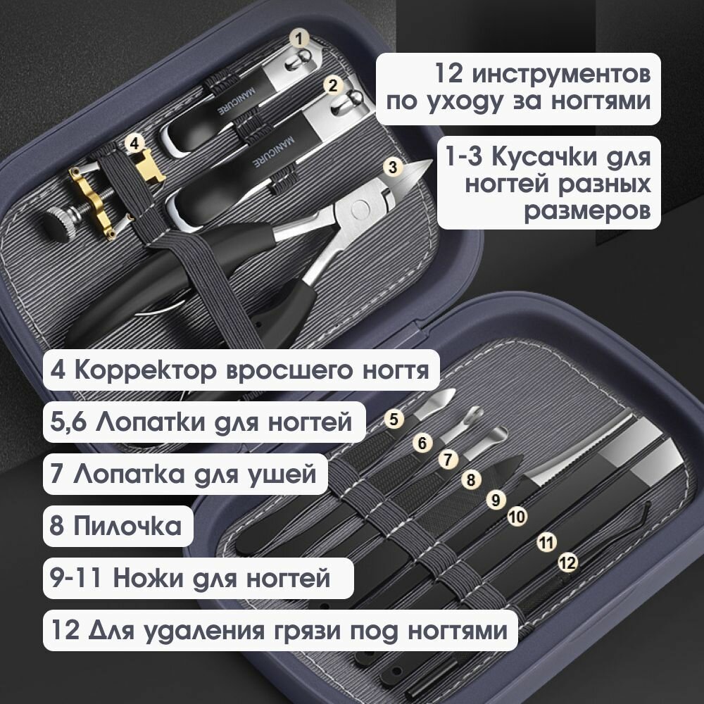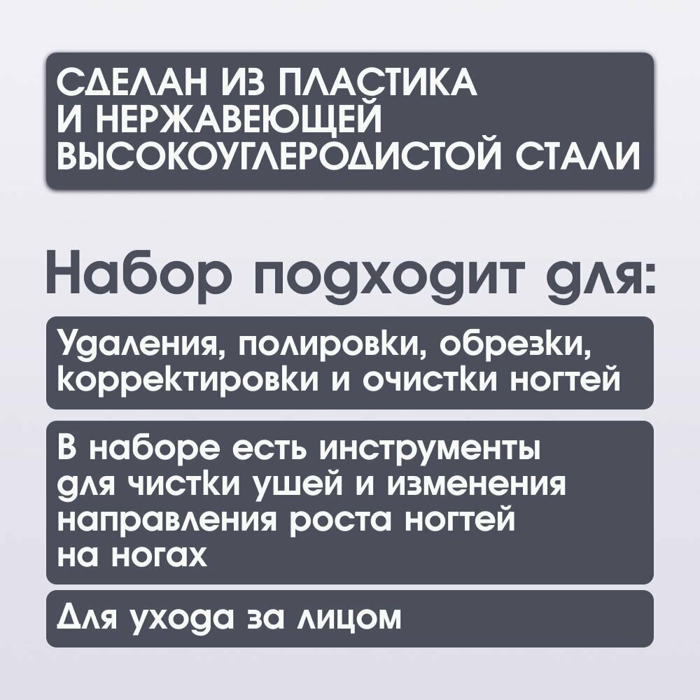 | Состав набора | книпсер, кусачки, кусачки для кутикулы, кусачки для маникюра, кусачки для педикюра, пилка, пилка педикюрная, пушер для кутикулы, скребок, триммер |