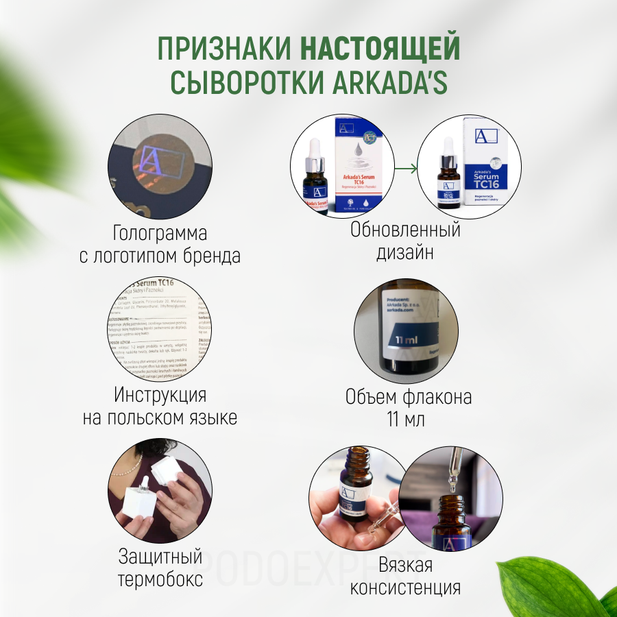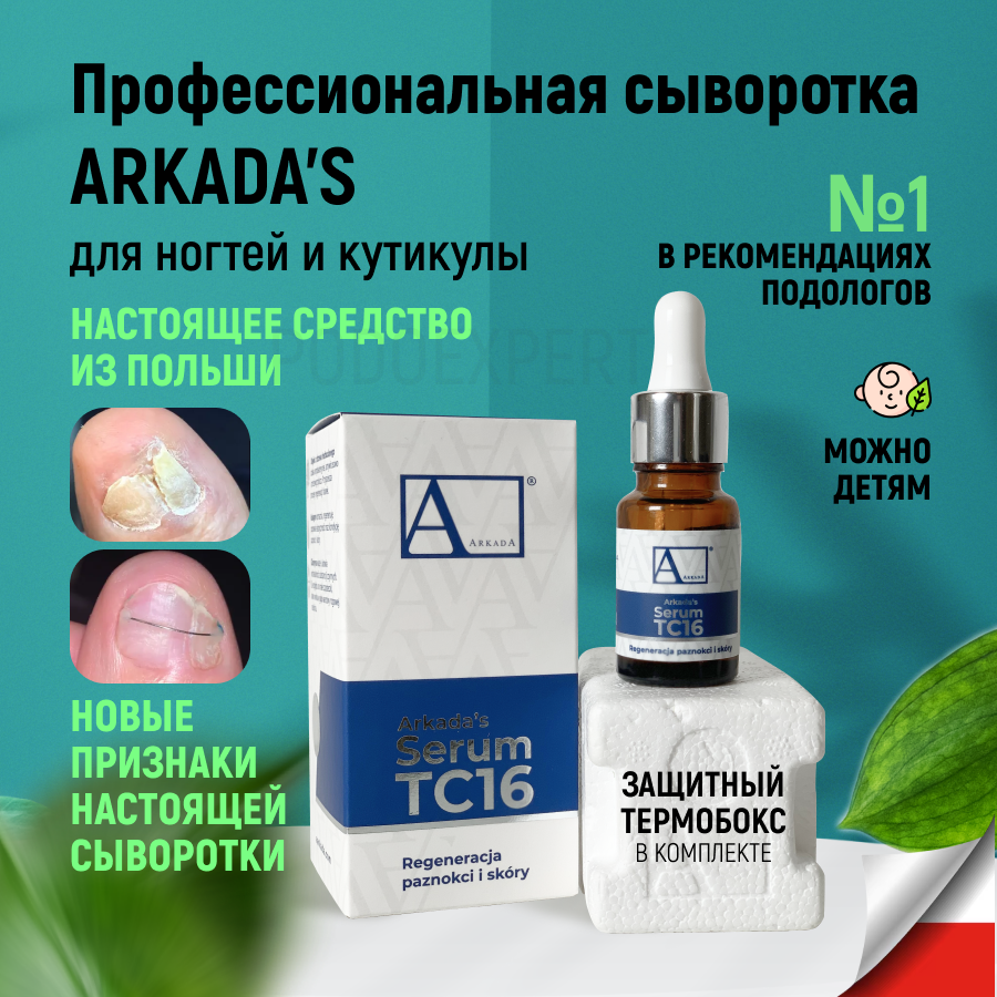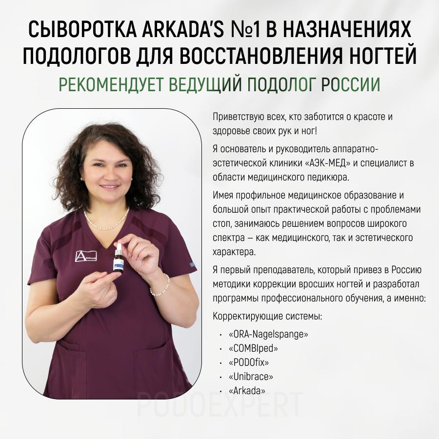 | Дополнительная информация | Сыворотка поставляется в Россию официальным дилером AArkada в России - компанией "Podoexpert". В нашей карточке Вы можете найти подробное видео, в котором мы рассказываем и показываем признаки настоящей сыворотки Arkada. Остерегайтесь подделок, они не просто бесполезны, они опасны для здоровья! |