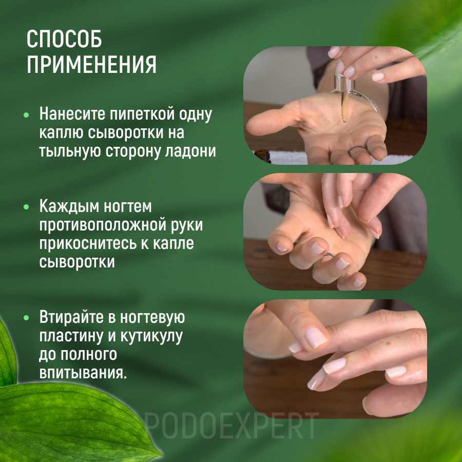 | Дополнительное действие | антибактериальный эффект, восстановление, выравнивание ногтевой пластины, от вросших ногтей, питание, противовоспалительное действие, противогрибковое действие, смягчение, увлажнение, укрепление ногтей, ускорение роста ногтей |