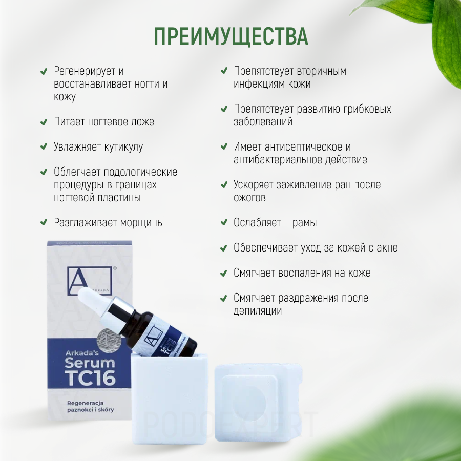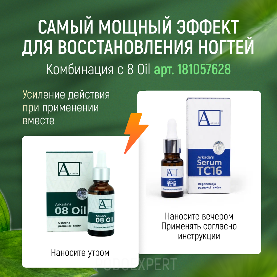 | Способ применения | Нанесите Arkada Serum TC 16 на ногтевую пластину и кутикулу тонким слоем, либо на любой другой участок кожи по необходимости. Для достижения наилучшего результата рекомендуется использовать сыворотку не реже двух раз в день. |