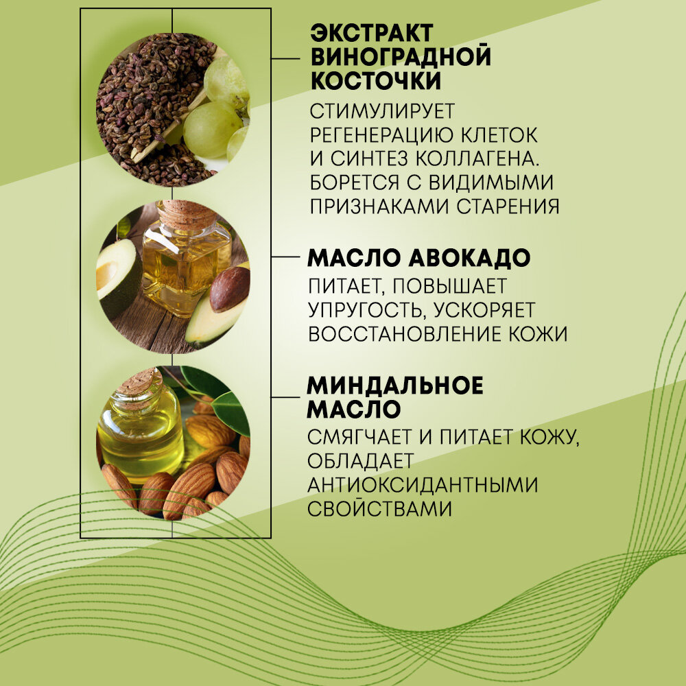 | Состав | Экстракт виноградной косточки: стимулирует регенерацию клеток и синтез коллагена. Борется с видимыми признаками старения. Оказывает противовоспалительное действие. Повышает уровень увлажненности кожи, способствуя укреплению ее водно-липидной мантии, защитного барьера. Масло авокадо: питает, повышает упругость, ускоряет восстановление кожи. Устраняет сухость, стянутость, шелушение. Миндальное масло: смягчает и питает кожу, обладает антиоксидантными свойствами, способствует заживлению микроповреждений. |