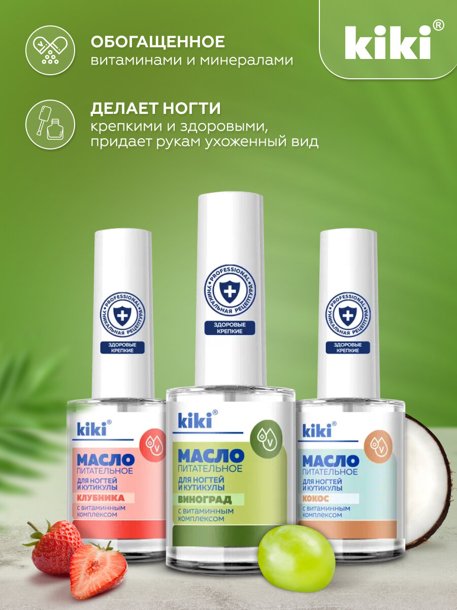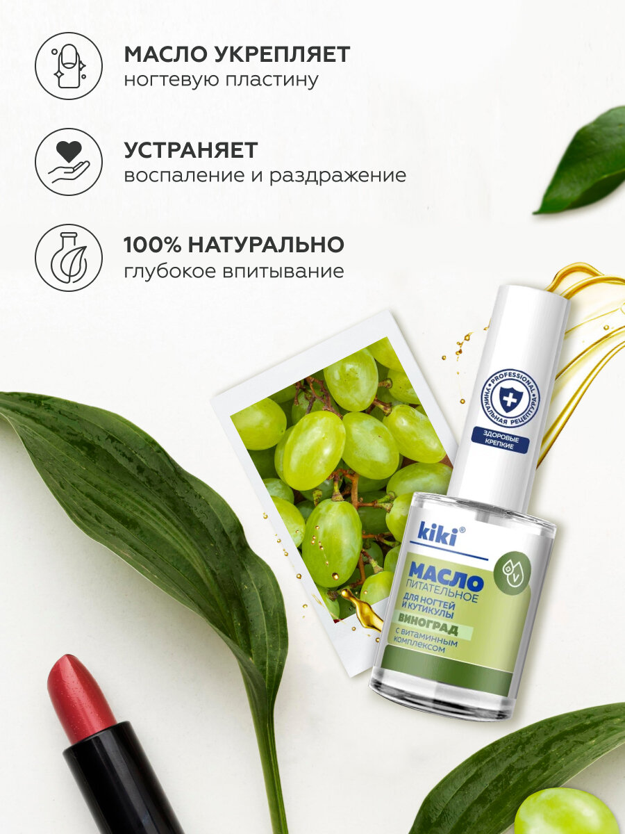 Масло для ногтей и кутикулы kiki для маникюра, педикюра, укрепление питание восстановление, с натуральным маслом виноградных косточек и витаминами А, Е, С, D, 12 мл аромат виноград