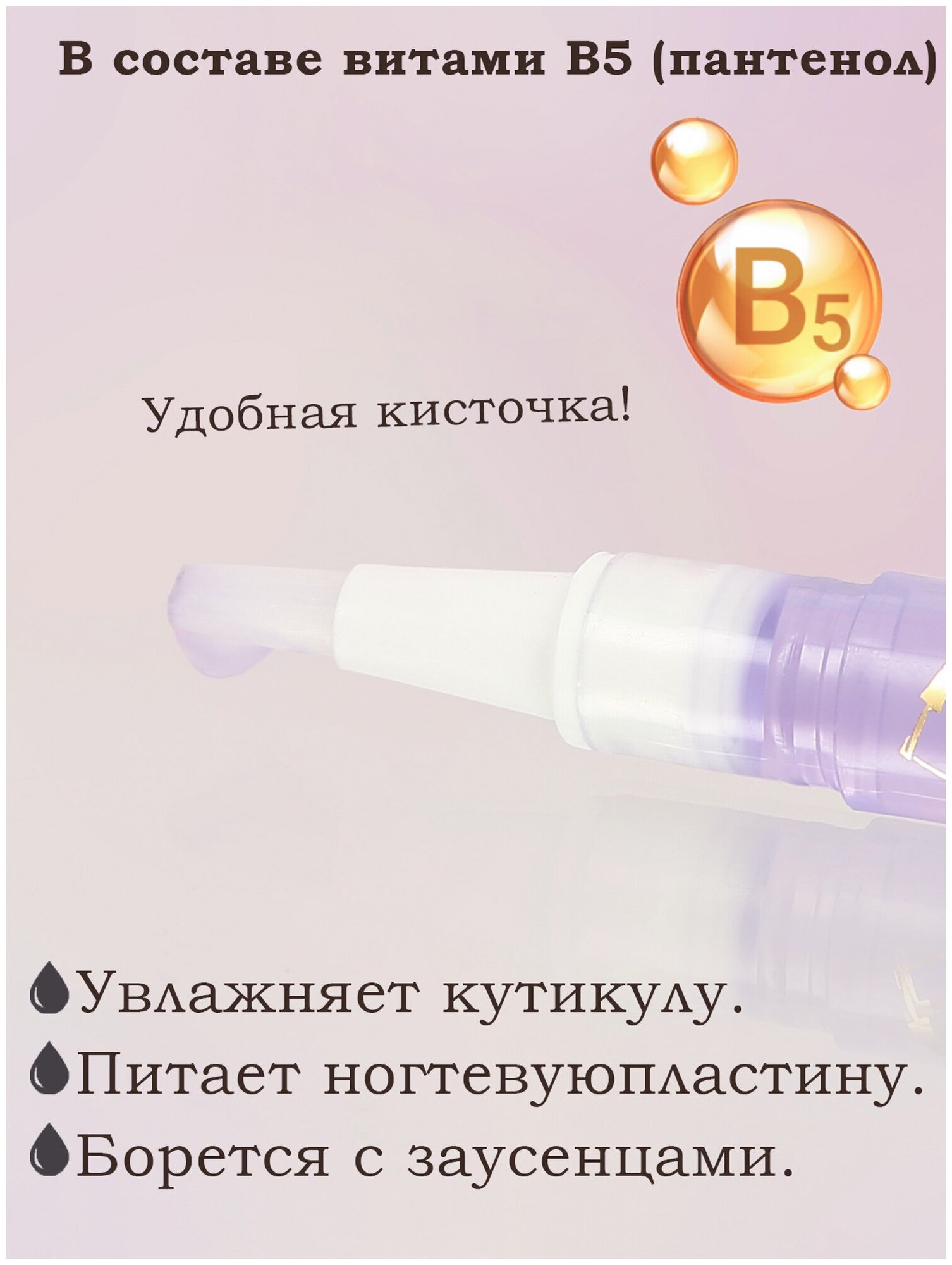 | Способ применения | Прокрутите основание несколько раз, пока масло не появится на кисточке. Распределите с её помощью средство по всей кутикуле. Для достижения максимального результата используйте ежедневно. |