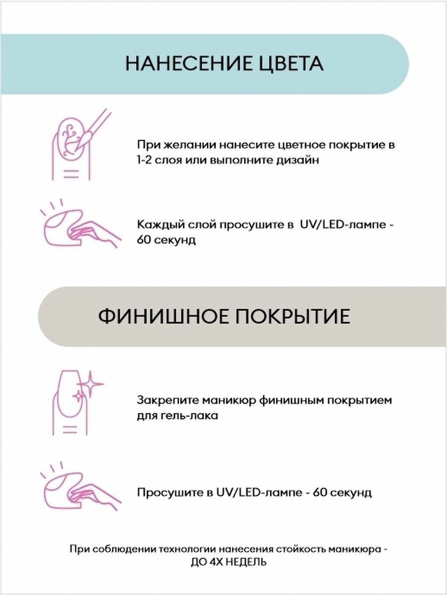 | Способ применения | Подготовка ногтевой пластины (НП): 1. Снимите природный глянец с натурального ногтя при помощи бафа или пилки для натуральных ногтей. 2. Выполните гигиенический маникюр любым привычным способом (аппаратный, обрезной, комбинированный). 3. Нанесите на НП дегидратор, подсушите на воздухе 60 сек. 4. Полусухой кистью нанесите праймер на НП, подсушите на воздухе 2-3 мин. Базовое покрытие: 1. Нанесите первый базовый слой втирающими движениями. 2. Просушите в UV/LED лампе - 60 сек. 3. Выполните наращивание или смоделируйте архитектуру ногтя. 4. Просушите в UV/L ED лампе - от 60 сек. 5. При необходимости выполните опил формы. Нанесение цвета: 1. Нанесите цветное покрытие в 1-2 слоя. 2. Каждый слой просушите в UV/LED лампе - от 60 сек. Финишное покрытие: 1. Закрепите маникюр финишным покрытием. 2. Просушите в UV/LED лампе - от 60 сек. При соблюдении технологии нанесения стойкость маникюра - до 4-Х недель. |