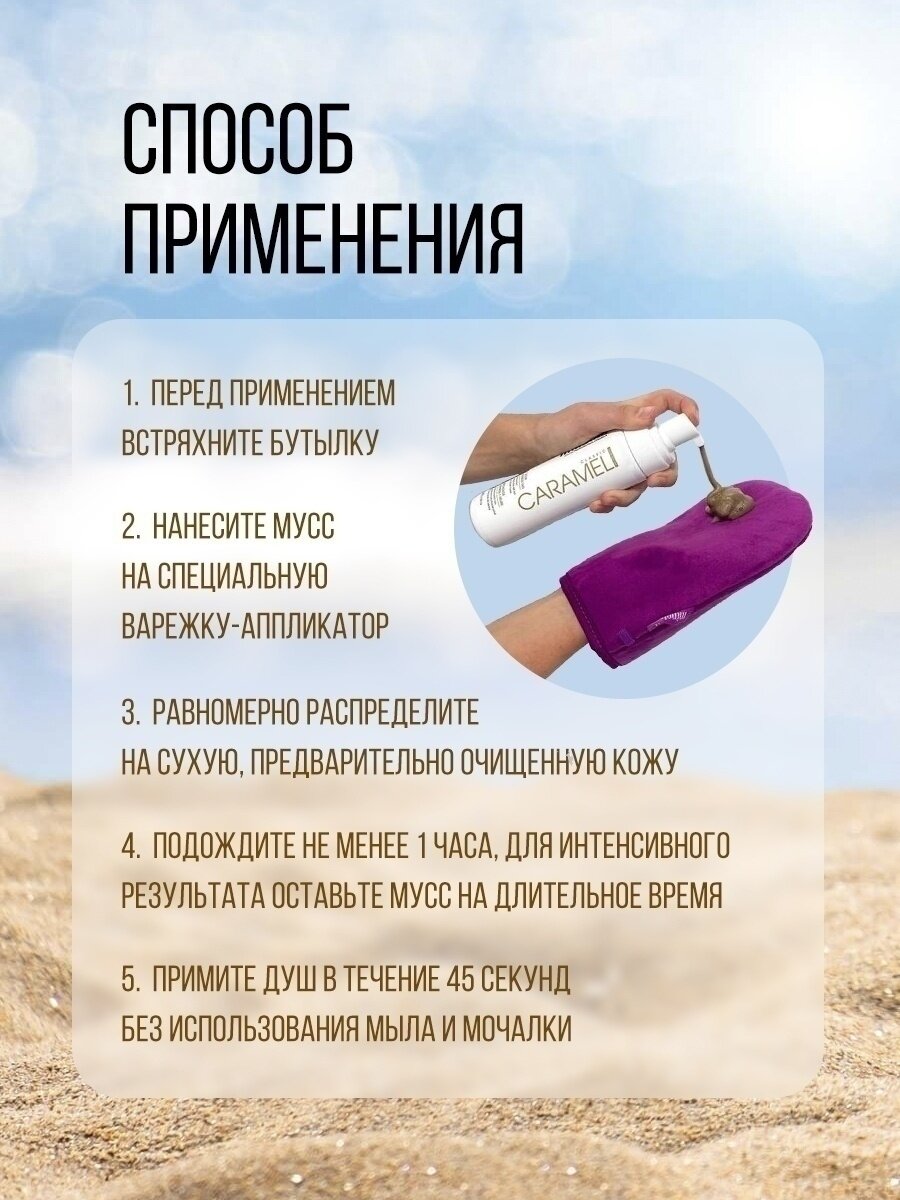 | Способ применения | Перед применением встряхнуть бутылку. Нанесите мусс на специальную варежку - аппликатор, равномерно распределите на сухую, предварительно очищенную кожу. Подождите не менее 1 часа, затем примите душ в течение 45 секунд без использования мыла и мочалки. Для получения интенсивного результата оставьте мусс на более длительное время. |