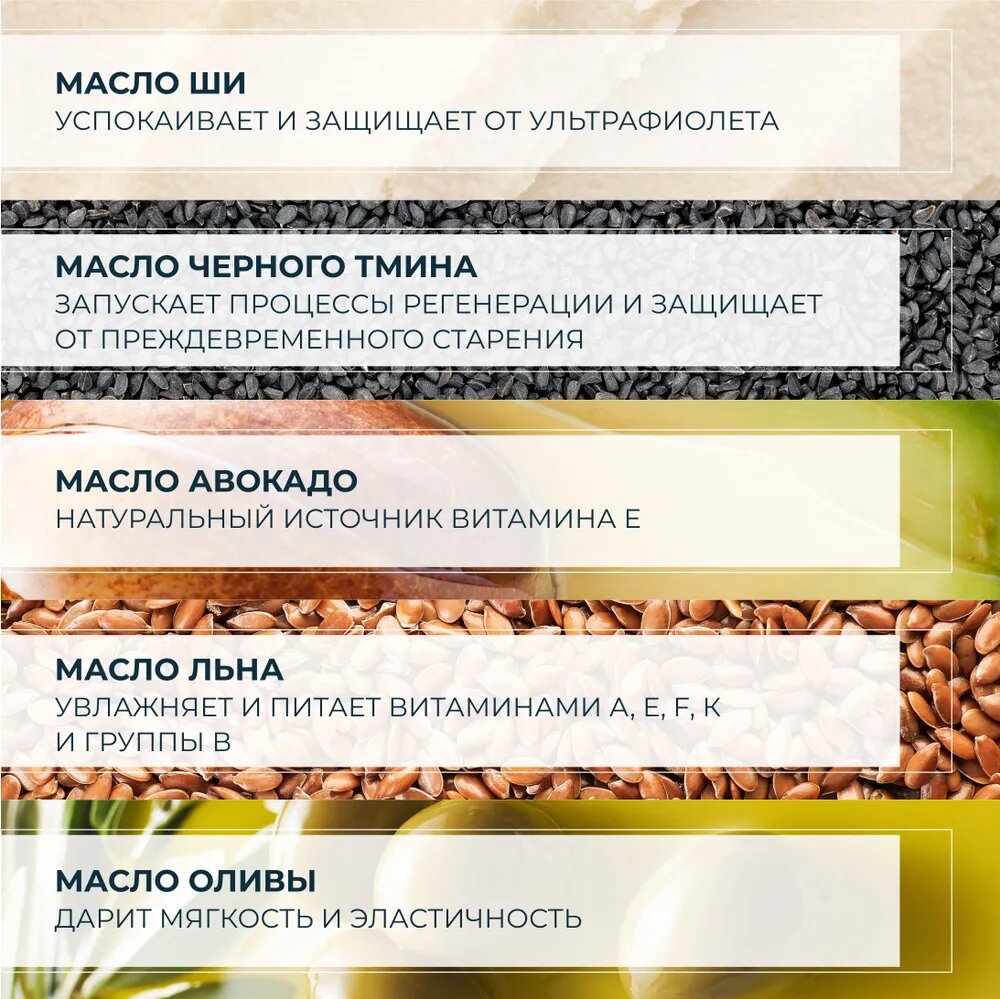 | Масла и экстракты | льняное масло / масло авокадо / масло ши / оливковое масло |