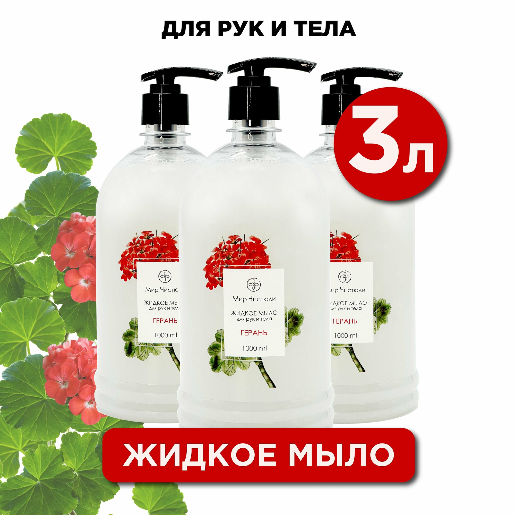 Жидкое мыло для рук и тела Мир Чистюли "Герань", 1 литр