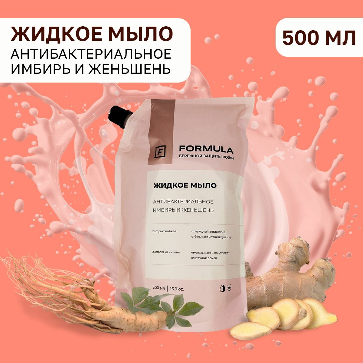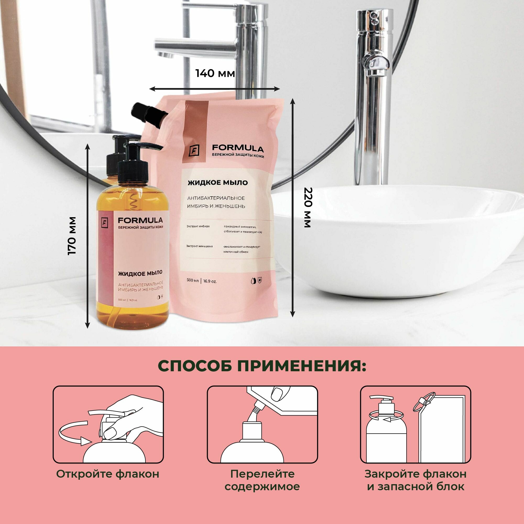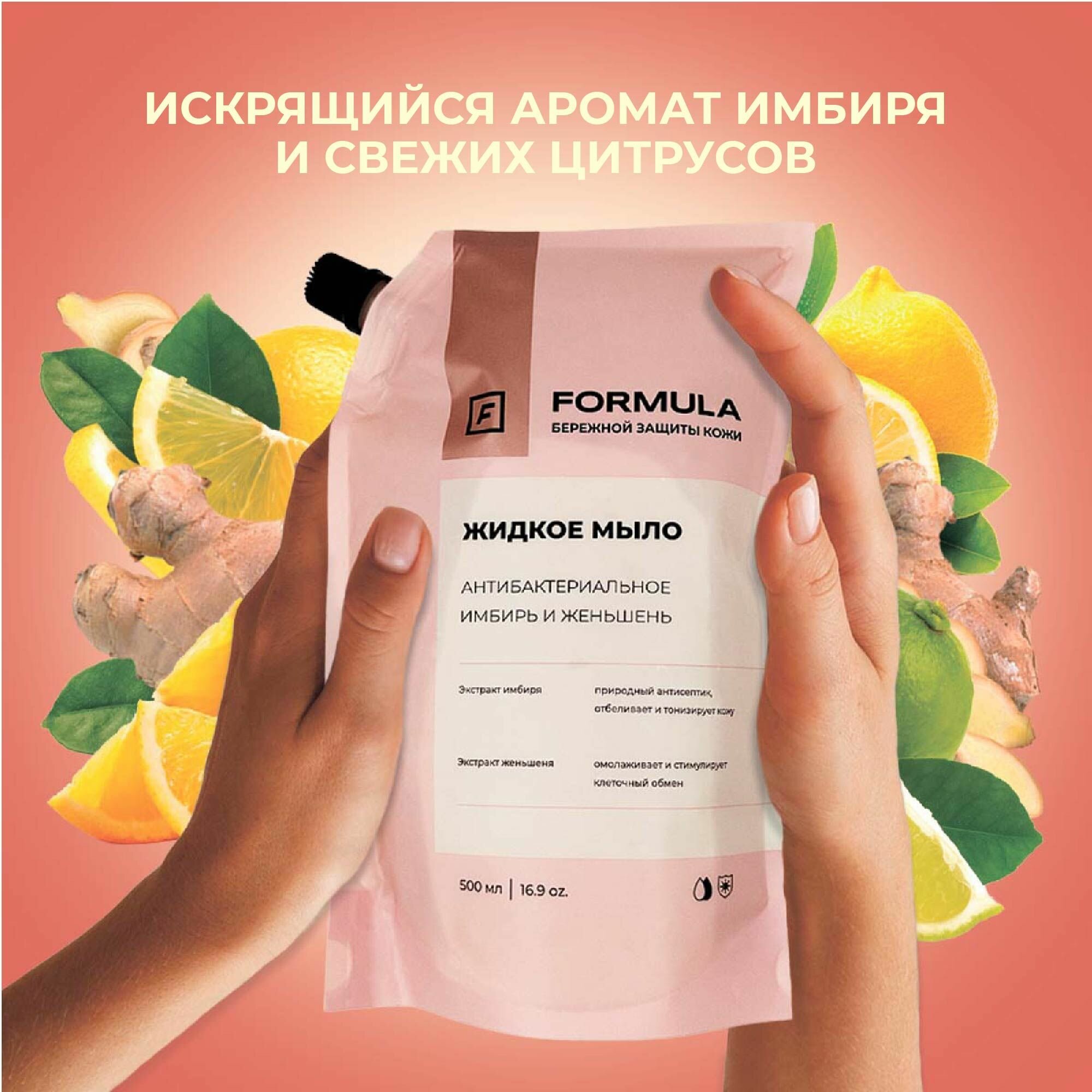 Formula Жидкое мыло антибактериальное имбирь и женьшень, 500 мл, Дой-пак 2 шт